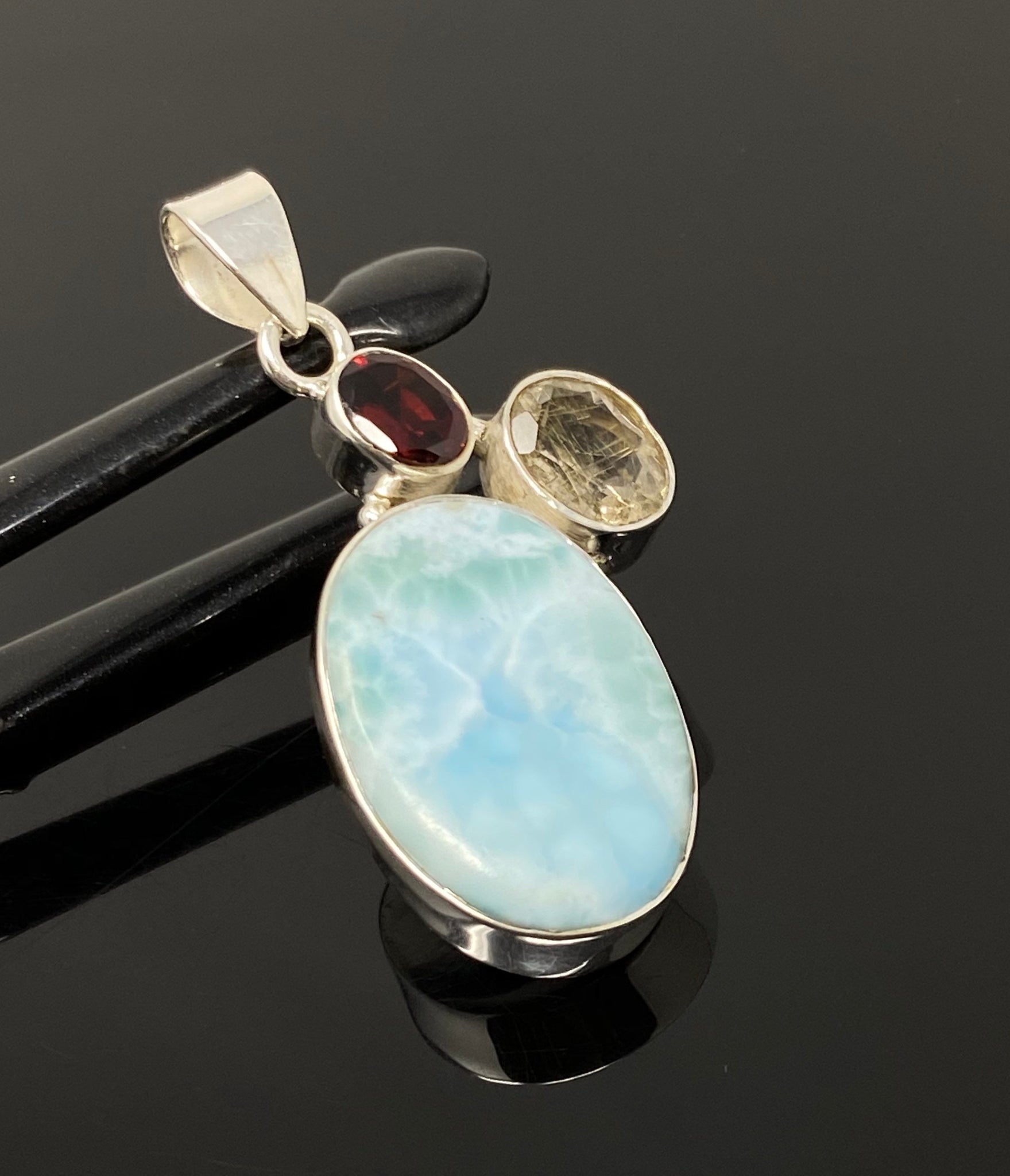 Natural Larimar with Garnet and Citrine Gemstone Pendant, Sterling Silver Jewelry, Larimar Pendant, Citrine Pendant, Bohemian Jewelry