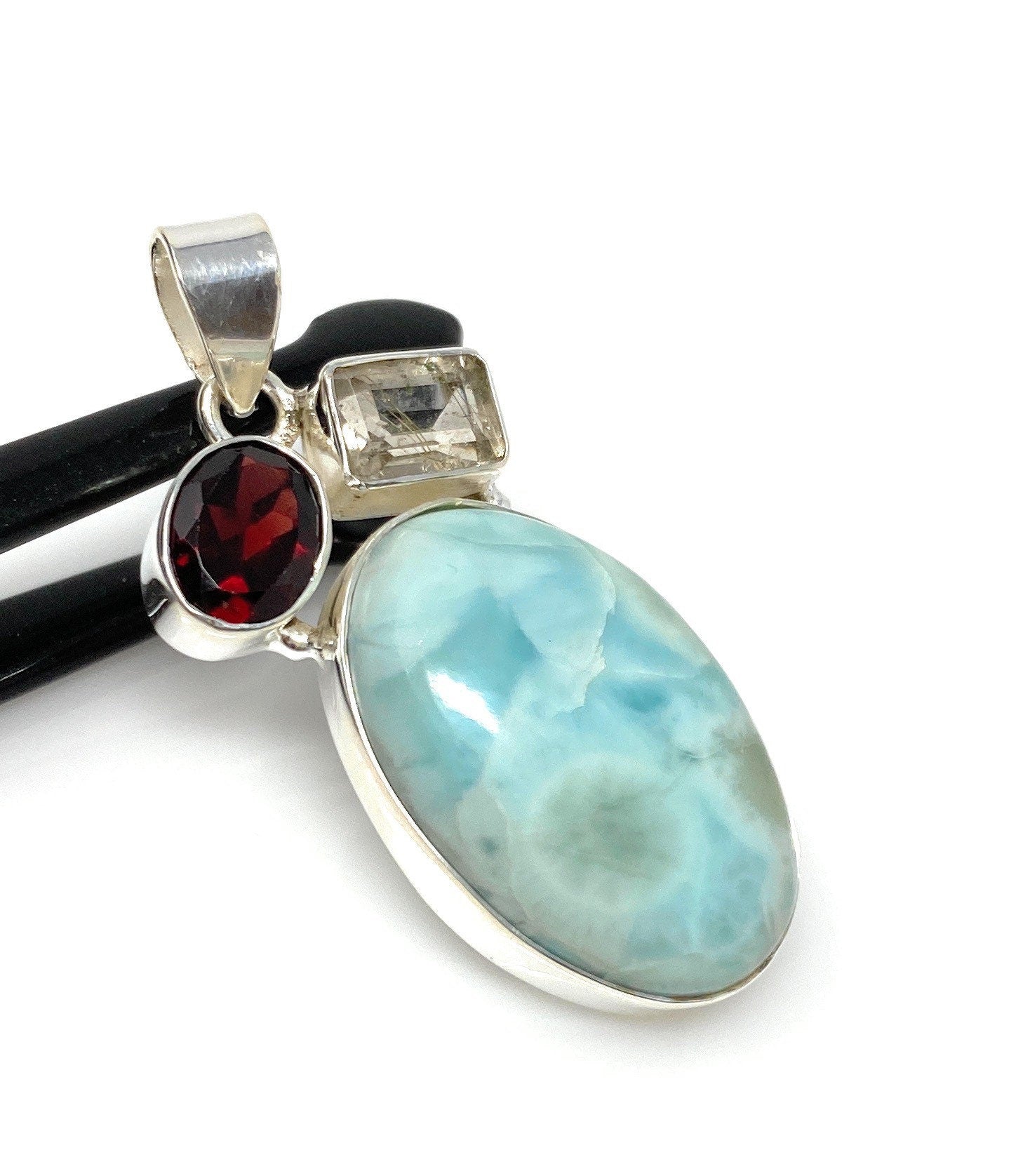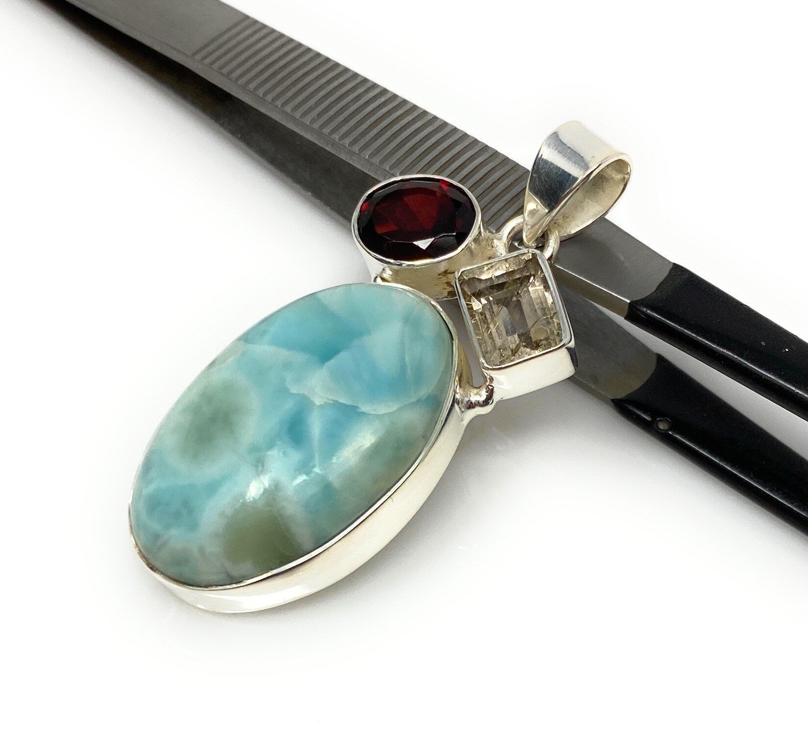 Natural Larimar with Garnet and Golden Rutile Gemstone Pendant, Sterling Silver Jewelry, Larimar Pendant, Bohemian Jewelry