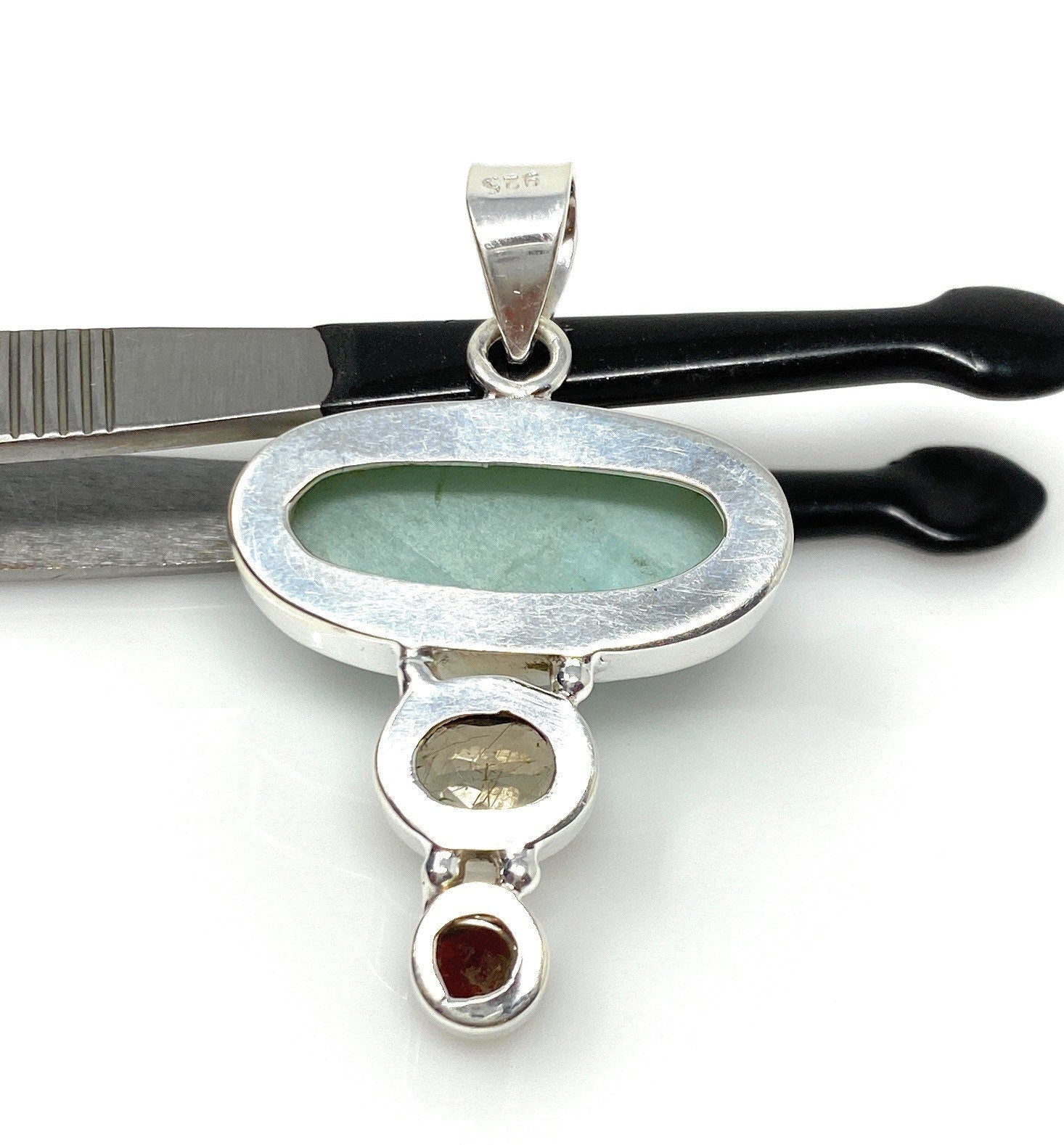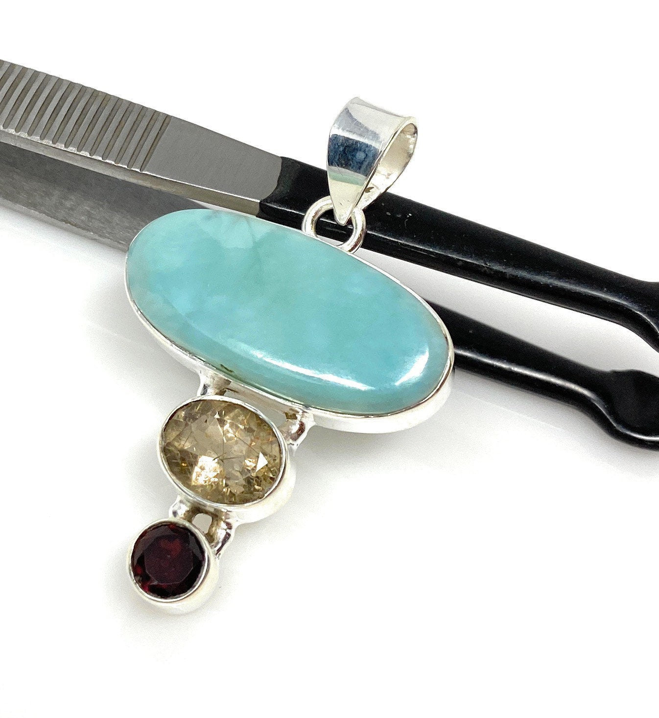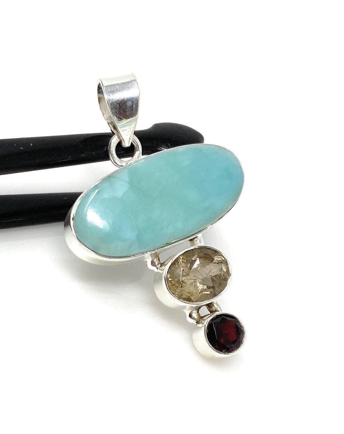 Natural Larimar with Garnet and Yellow Rutile Gemstone Pendant, Sterling Silver Jewelry, Larimar Pendant, Bohemian Jewelry