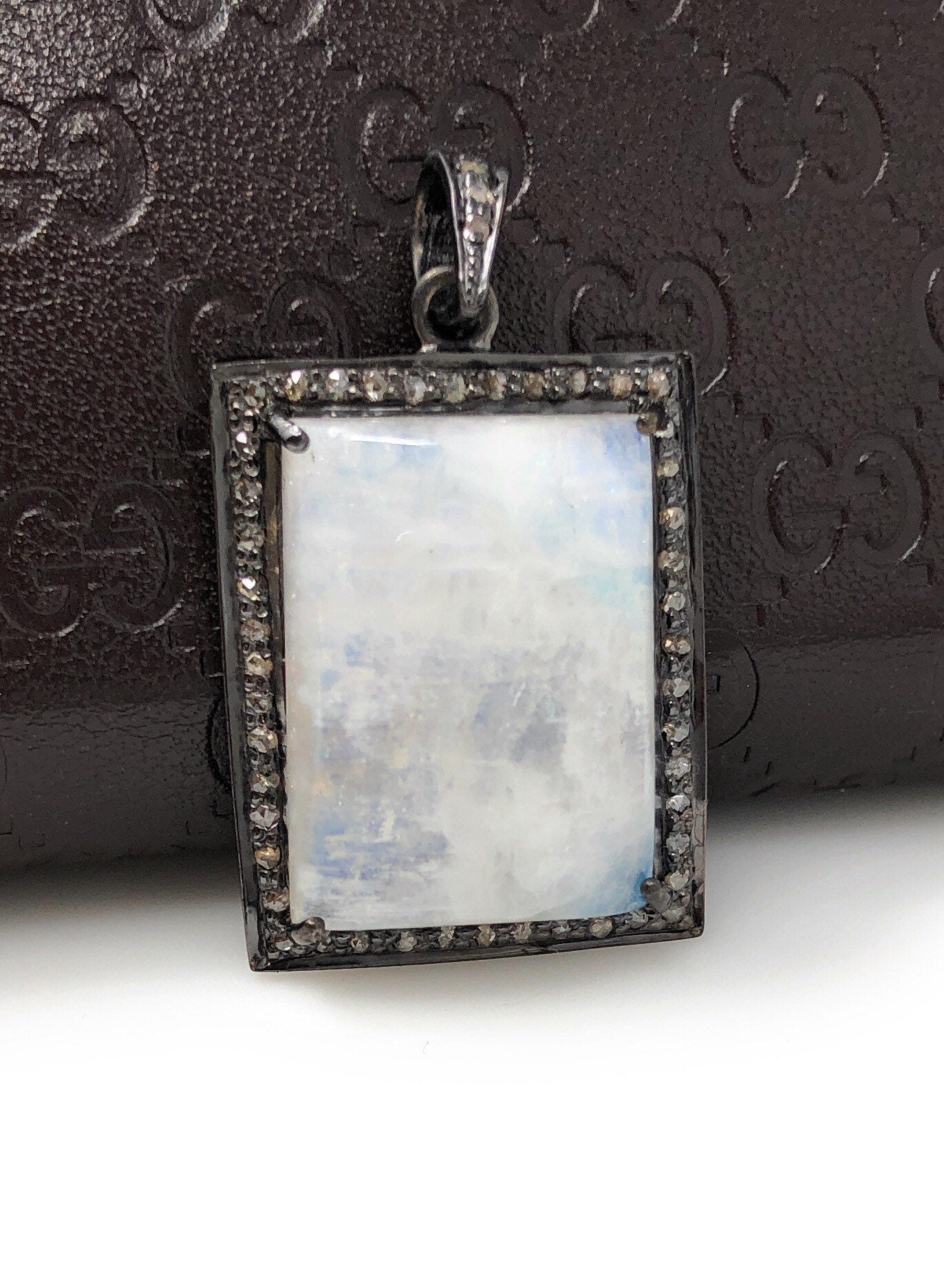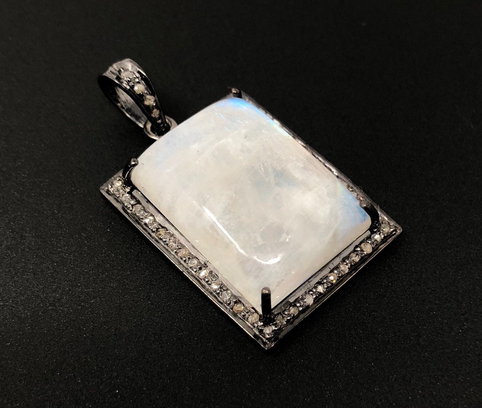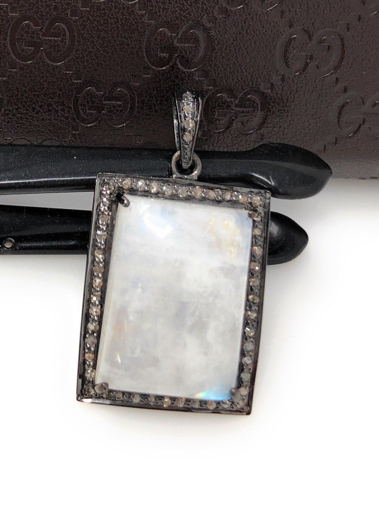 This exclusive beautiful Handmade AAA+ Grade Large Natural Rainbow Moonstone Gemstone Rectangle Shape Oxidized 925 Sterling Silver Pave Diamond Bezel Setting Pendant is an excellent choice for any occasion and makes a great gift for the loved ones.