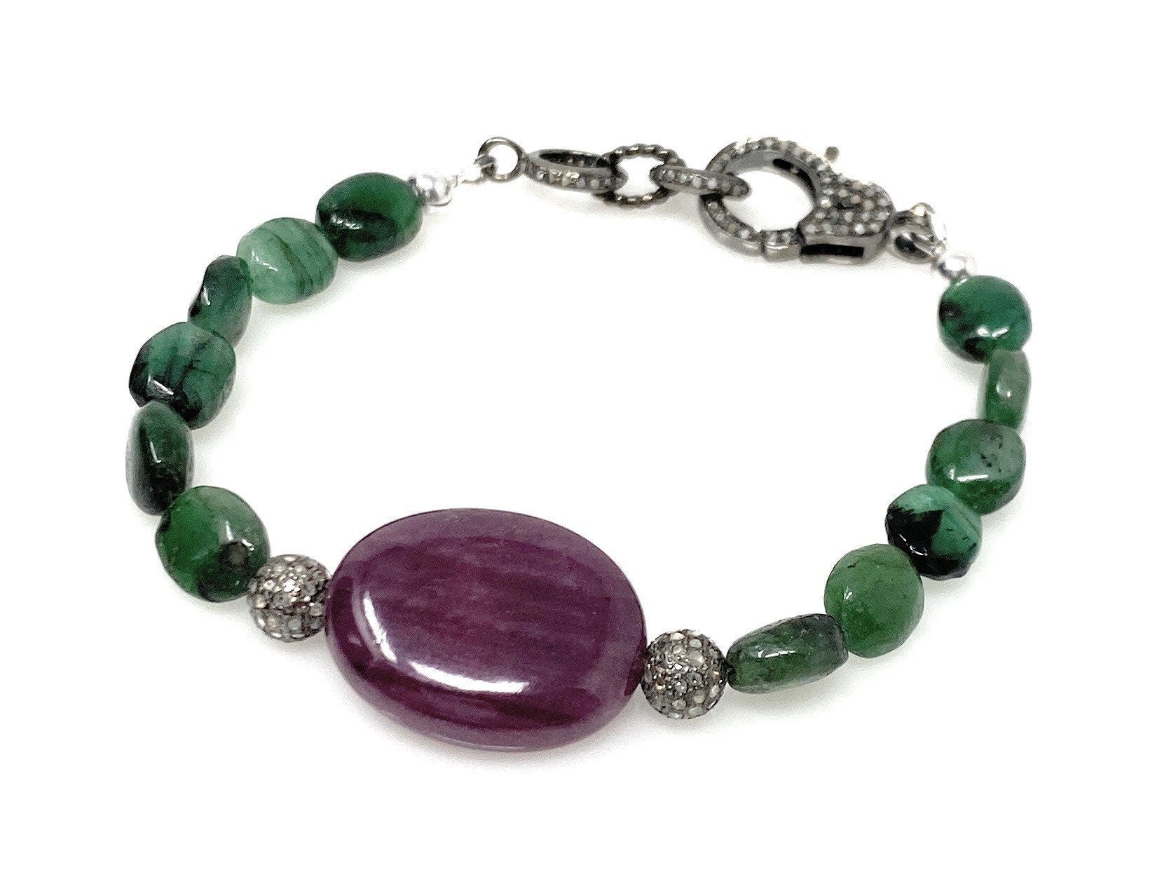 This beautiful Handmade AAA Grade Natural Ruby and Emerald Nugget Gemstone Beads Sterling Silver Pave Diamond Adjustable Bracelet is made by using large Ruby piece in center with Genuine Diamond Beads on the side with Smooth Emerald Nugget Beads .