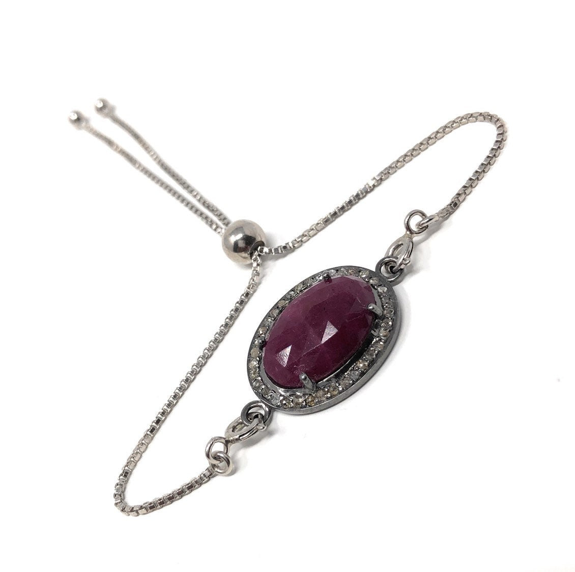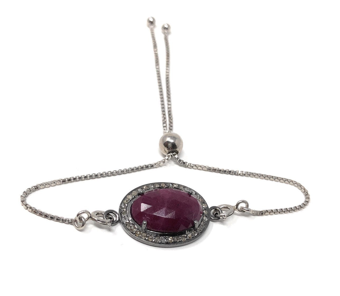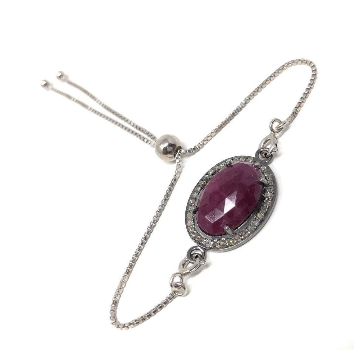 Natural Ruby Pave Diamond Bracelet , Sterling Silver Adjustable Bolo Bracelet, Gemstone Bracelet, Jewelry Gifts for Her