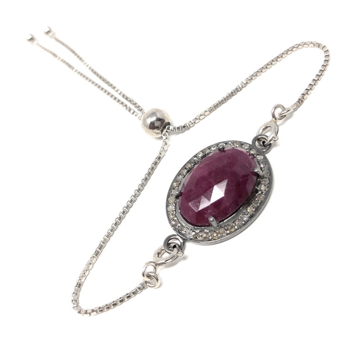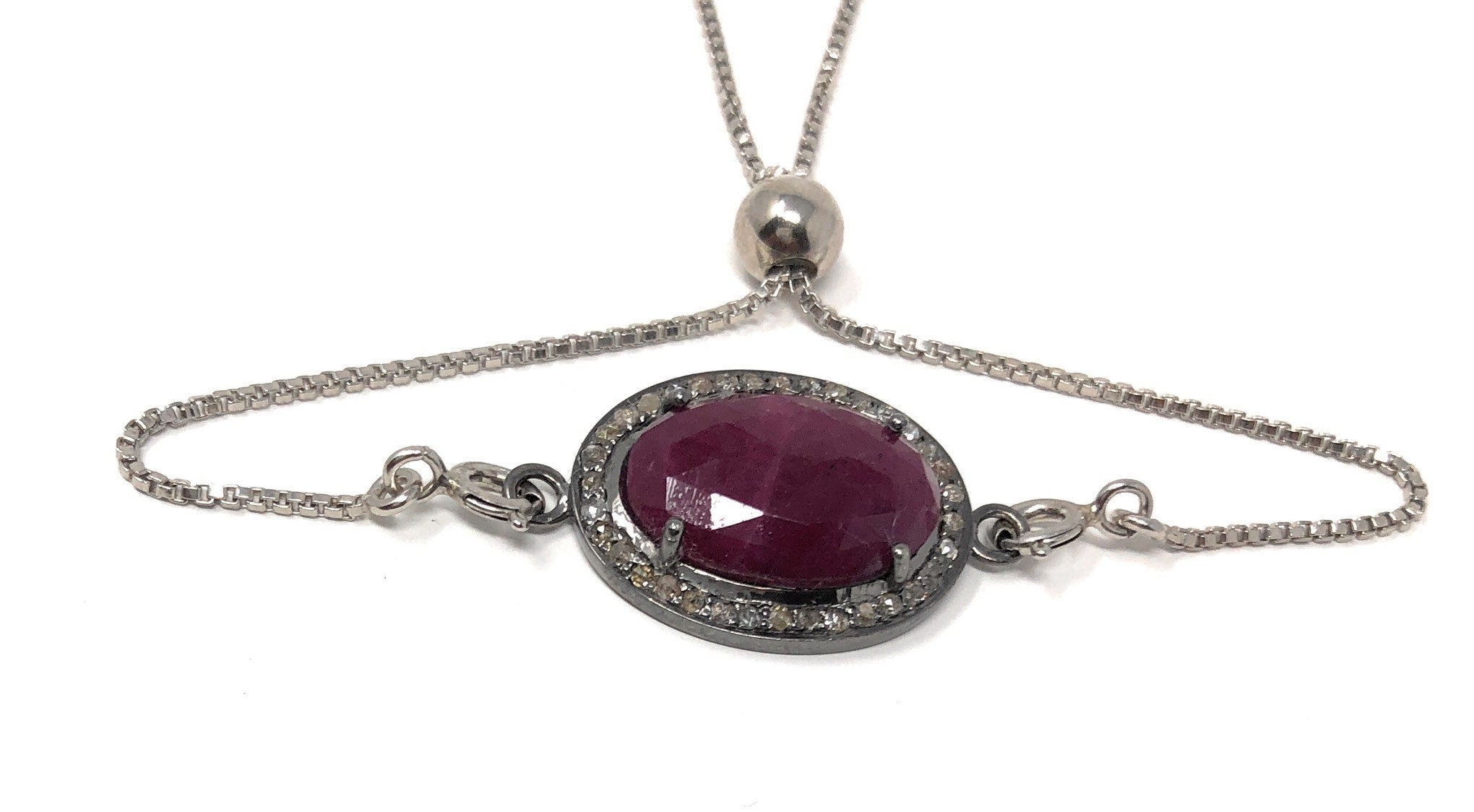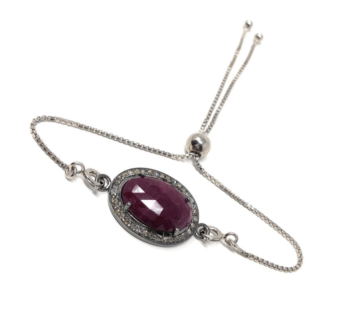 Natural Ruby Pave Diamond Bracelet , Sterling Silver Adjustable Bolo Bracelet, Gemstone Bracelet, Jewelry Gifts for Her