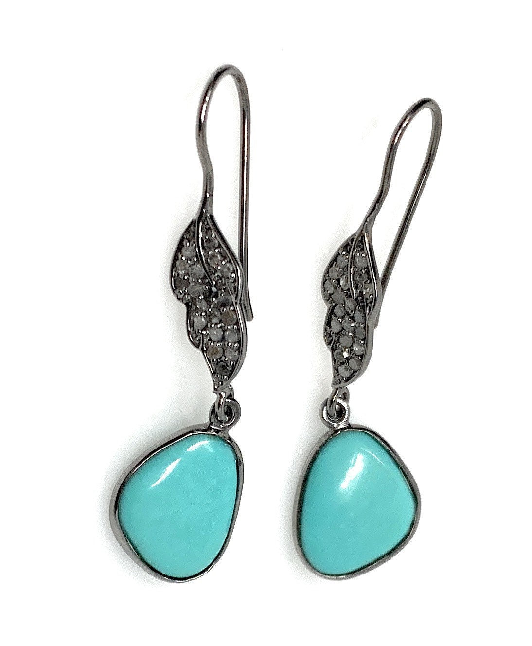 Natural Sleeping Beauty Turquoise Earrings, Pave Diamond Earrings, Victorian Gemstone Earrings, Robin Egg Turquoise, 1.65” x 0.50”