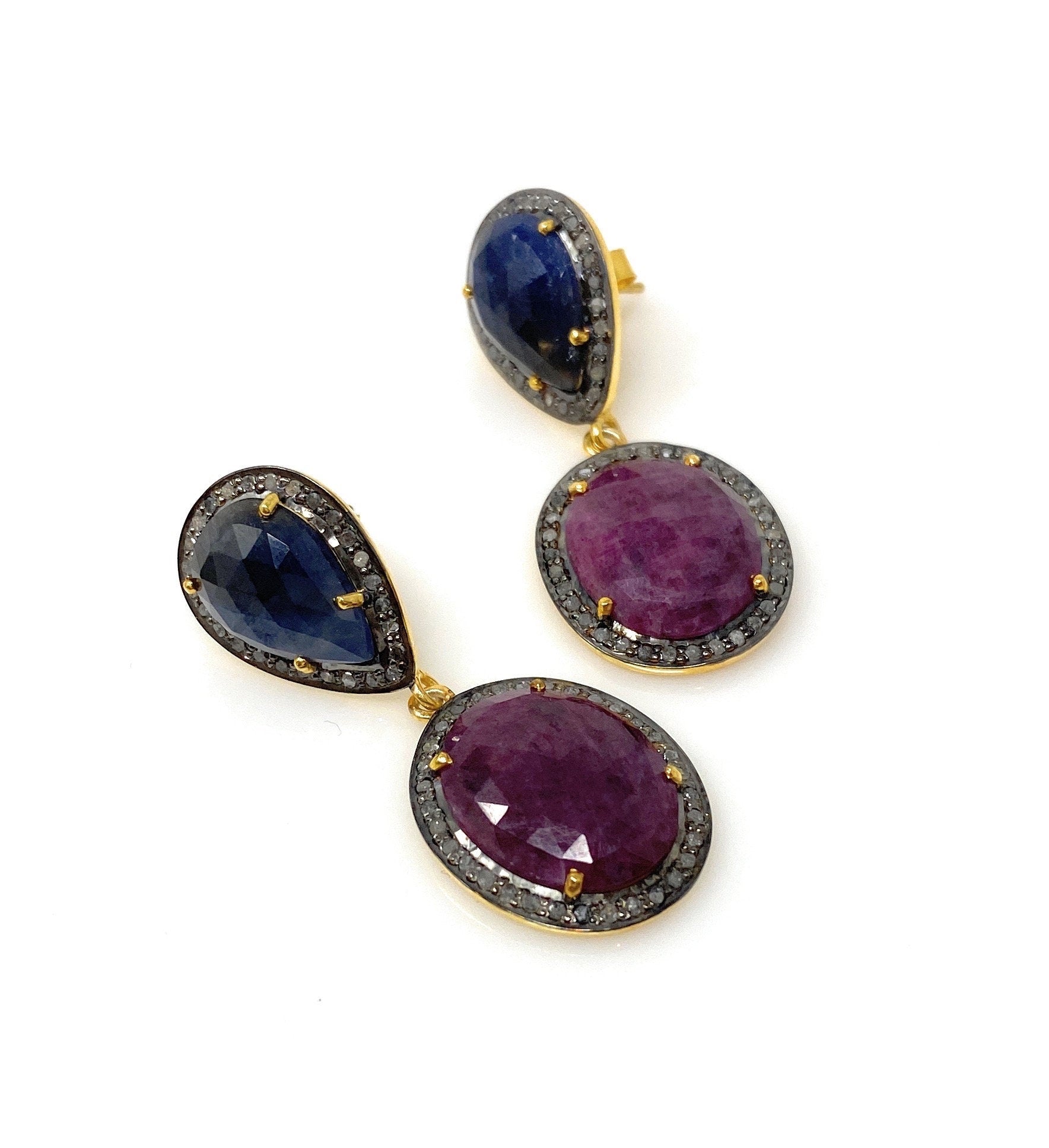 Pave Diamond Ruby and Blue Sapphire Earrings, Gemstone Earrings, Victorian Jewelry