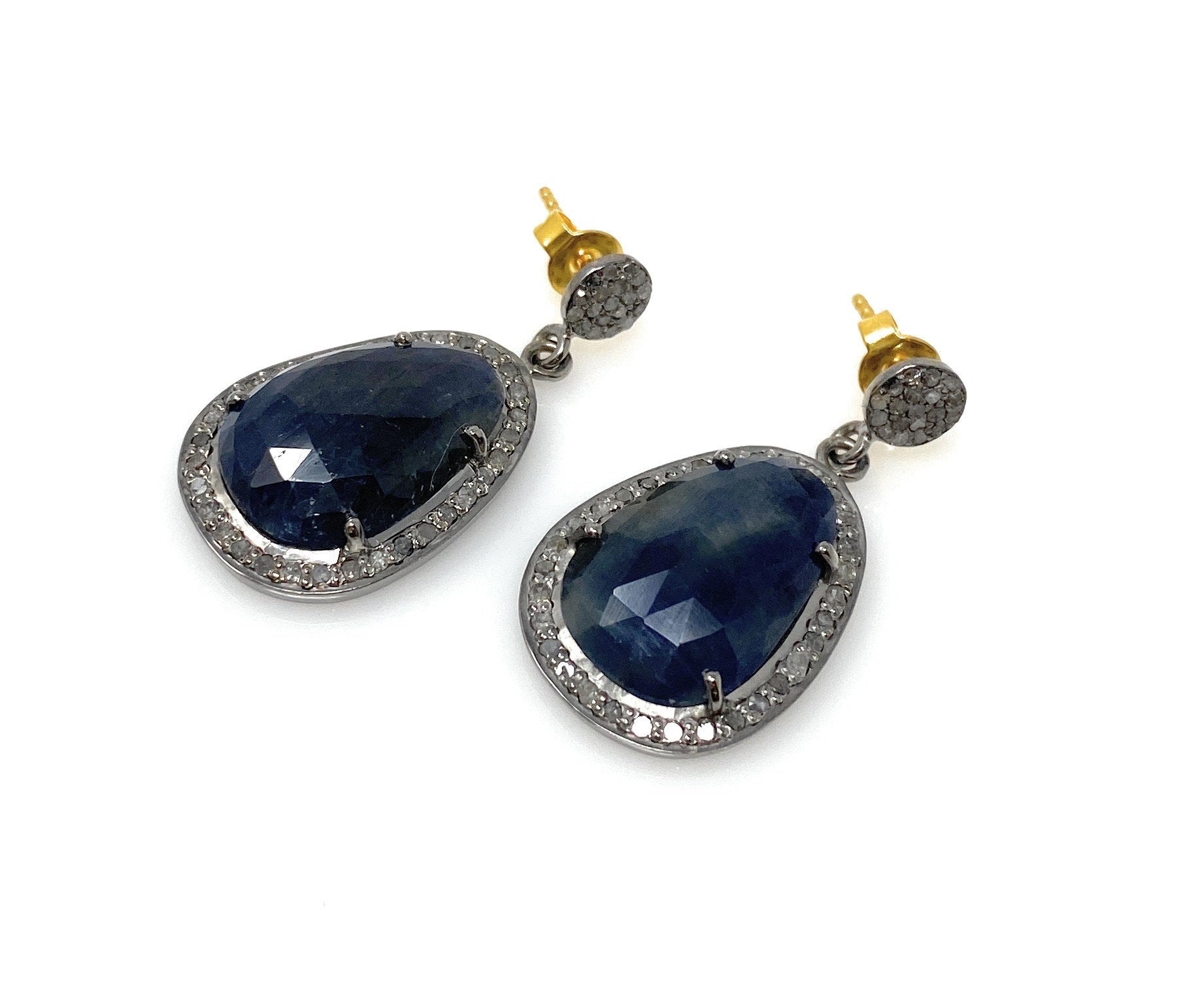 These beautiful Rose Cut Sapphire Earrings are handmade with meticulous care using genuine diamonds and Natural Gemstones bezel set in Black Rhuthenium over Sterling Silver and 14K Gold Plated Post.