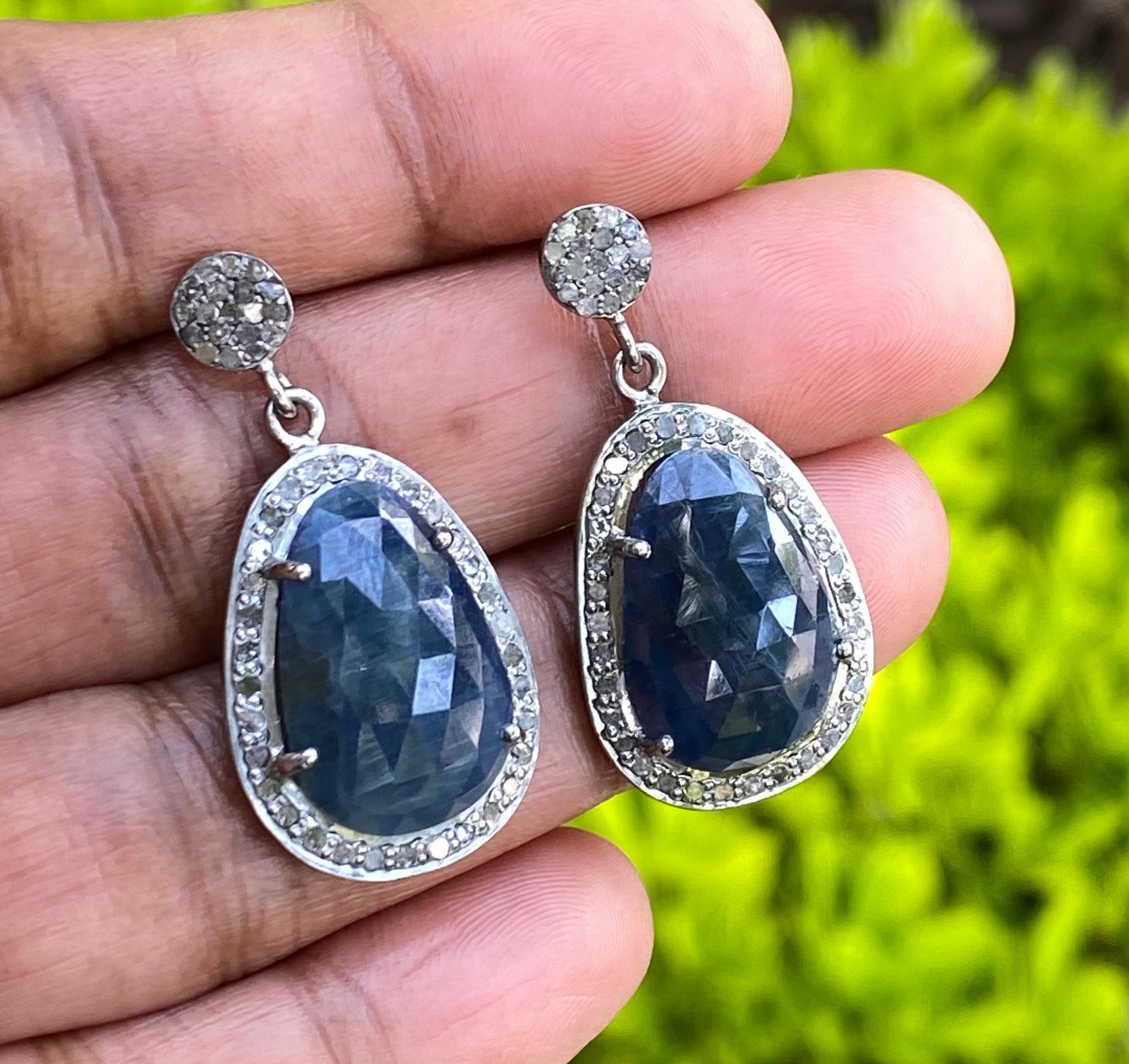 Pave Diamond Sapphire Earrings, Natural Blue Sapphire Gemstone Earrings, Dangle Victorian Earrings, 1.25” x 0.70”
