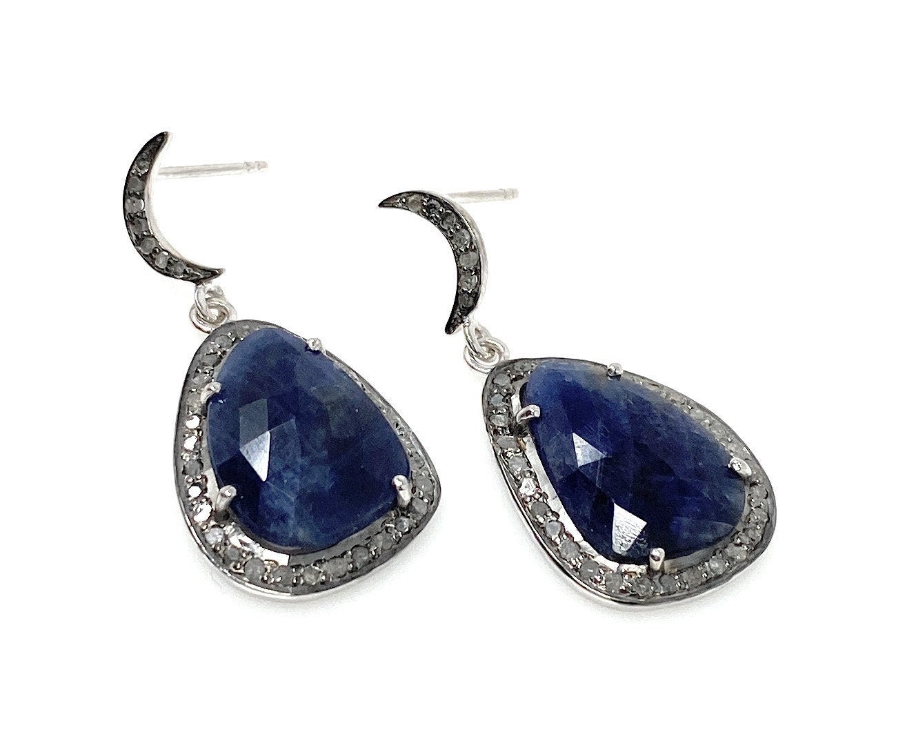 Pave Diamond Sapphire Earrings, Natural Blue Sapphire Gemstone Earrings, Moon Dangle Victorian Earrings, 1.35” x 0.65”