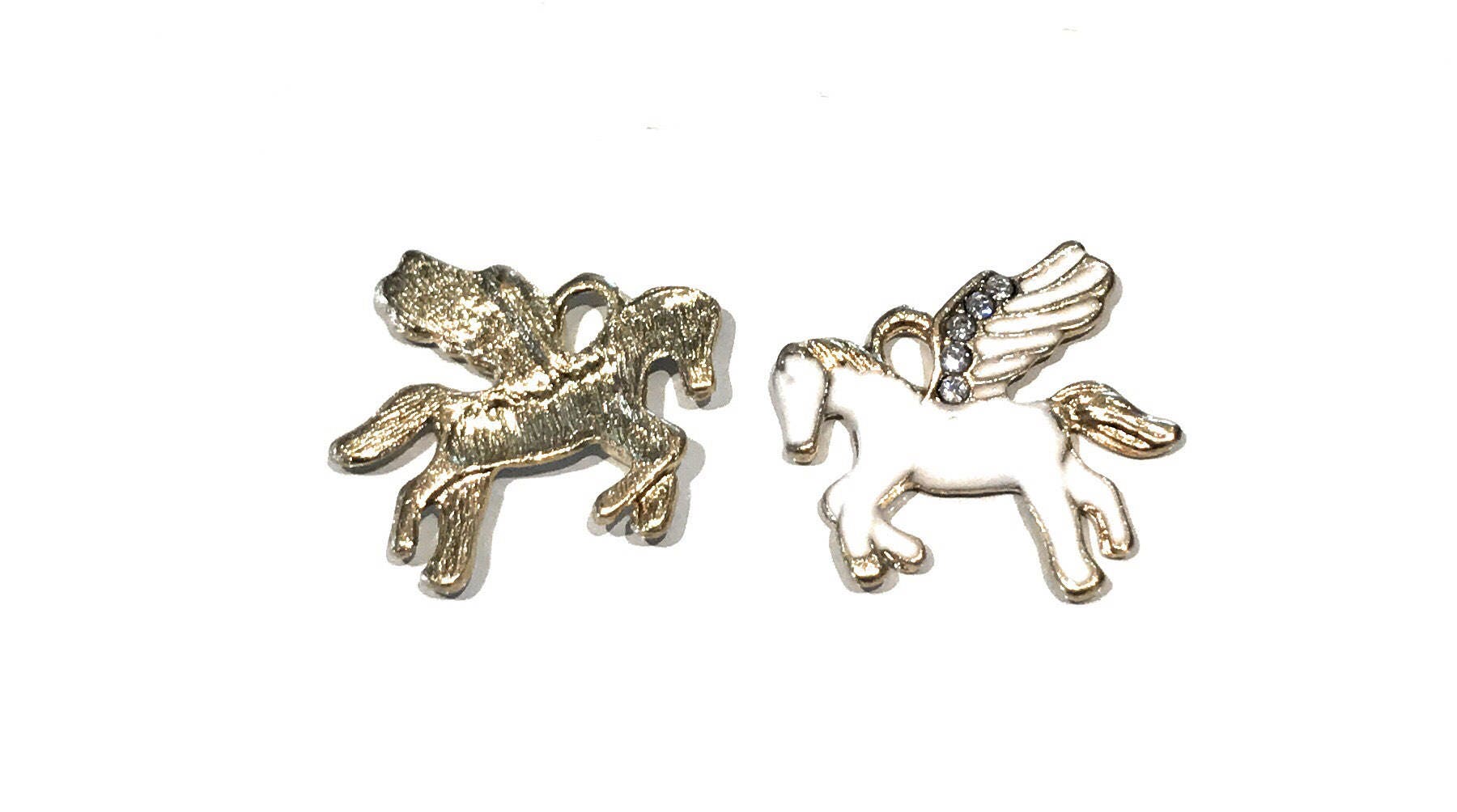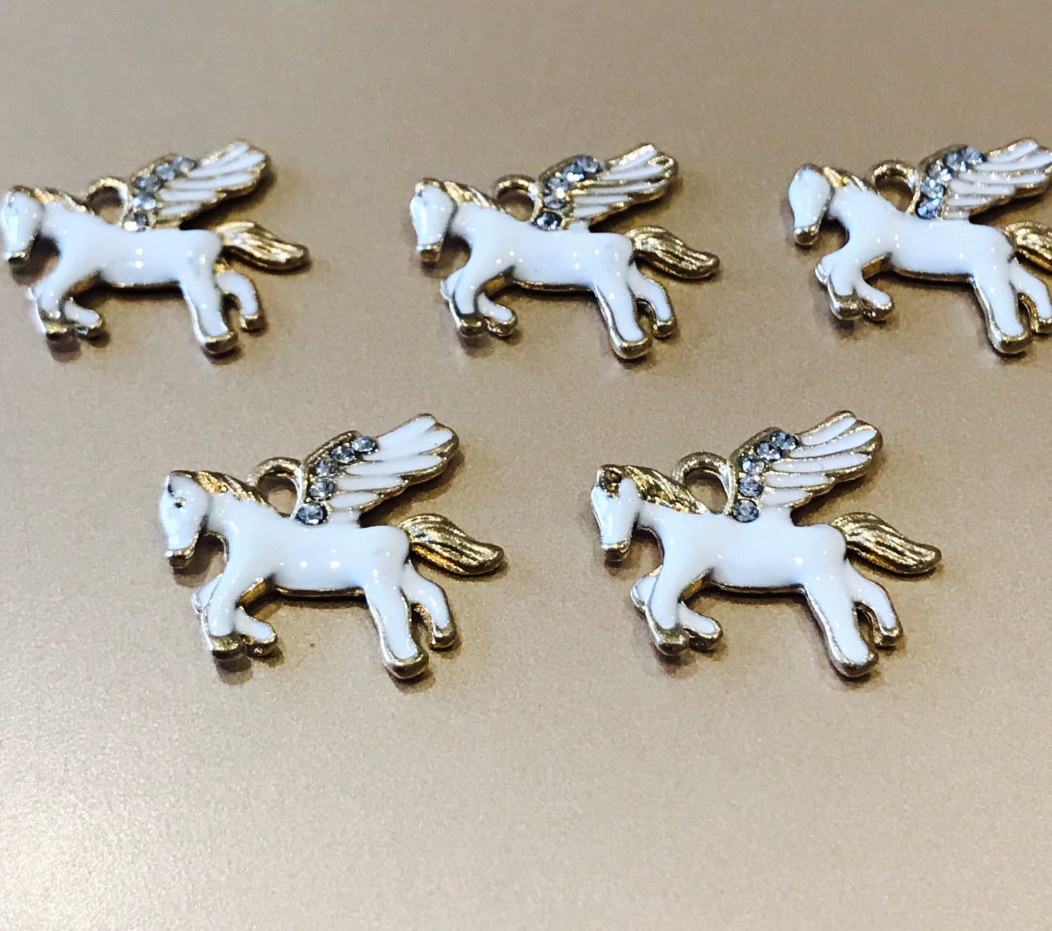 Gold Plated Pegasus with Wing Carved Clear Rhinestone White Enamel Charm for Jewelry Making.