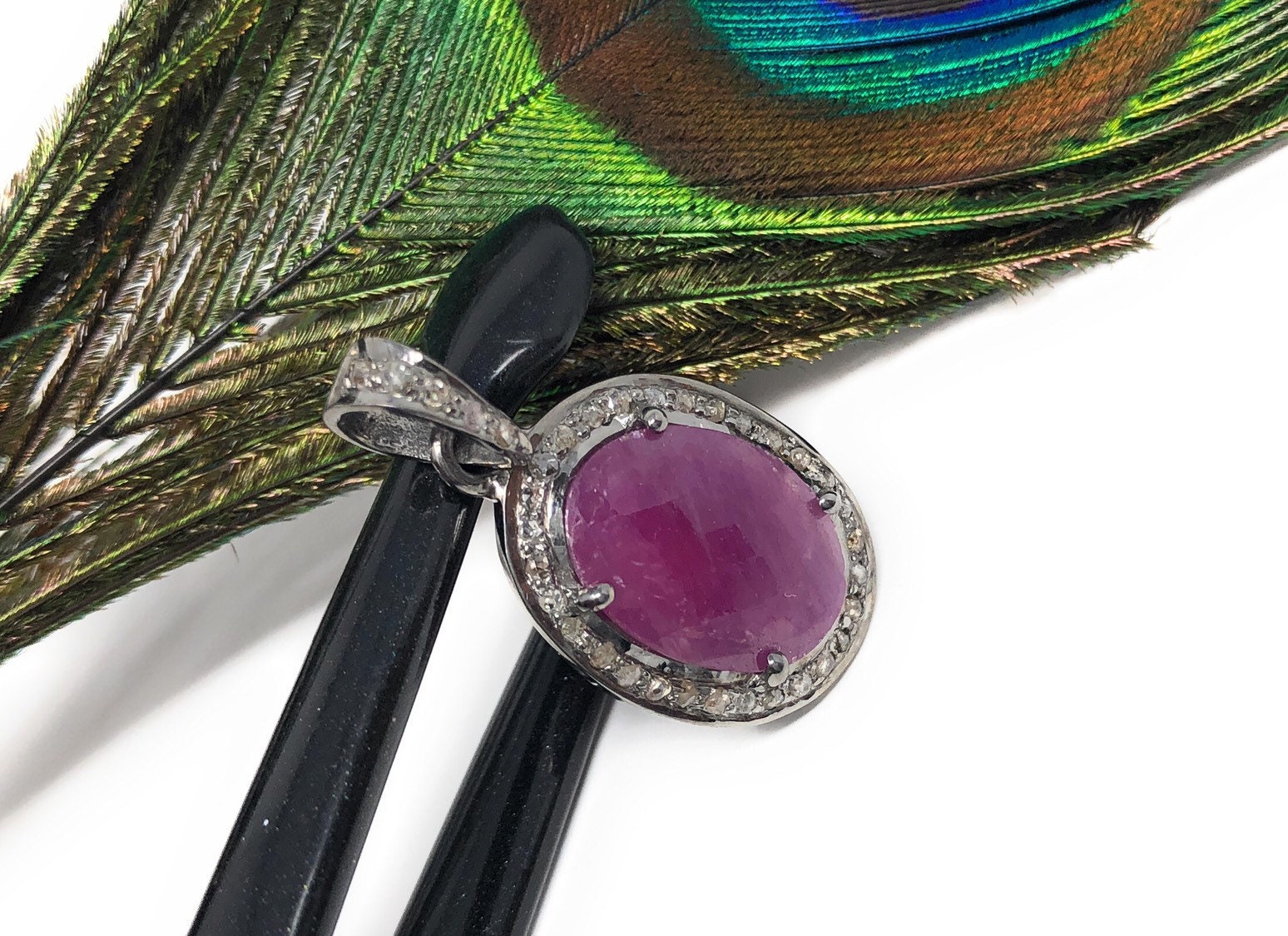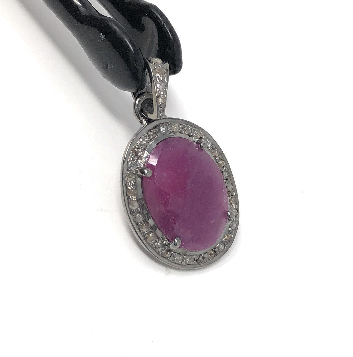 Sterling Silver Natural Gemstone Pink Sapphire Pave Diamond Pendant