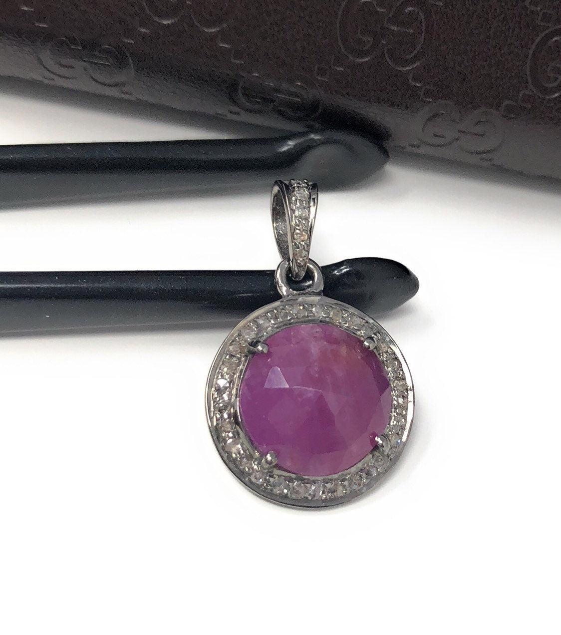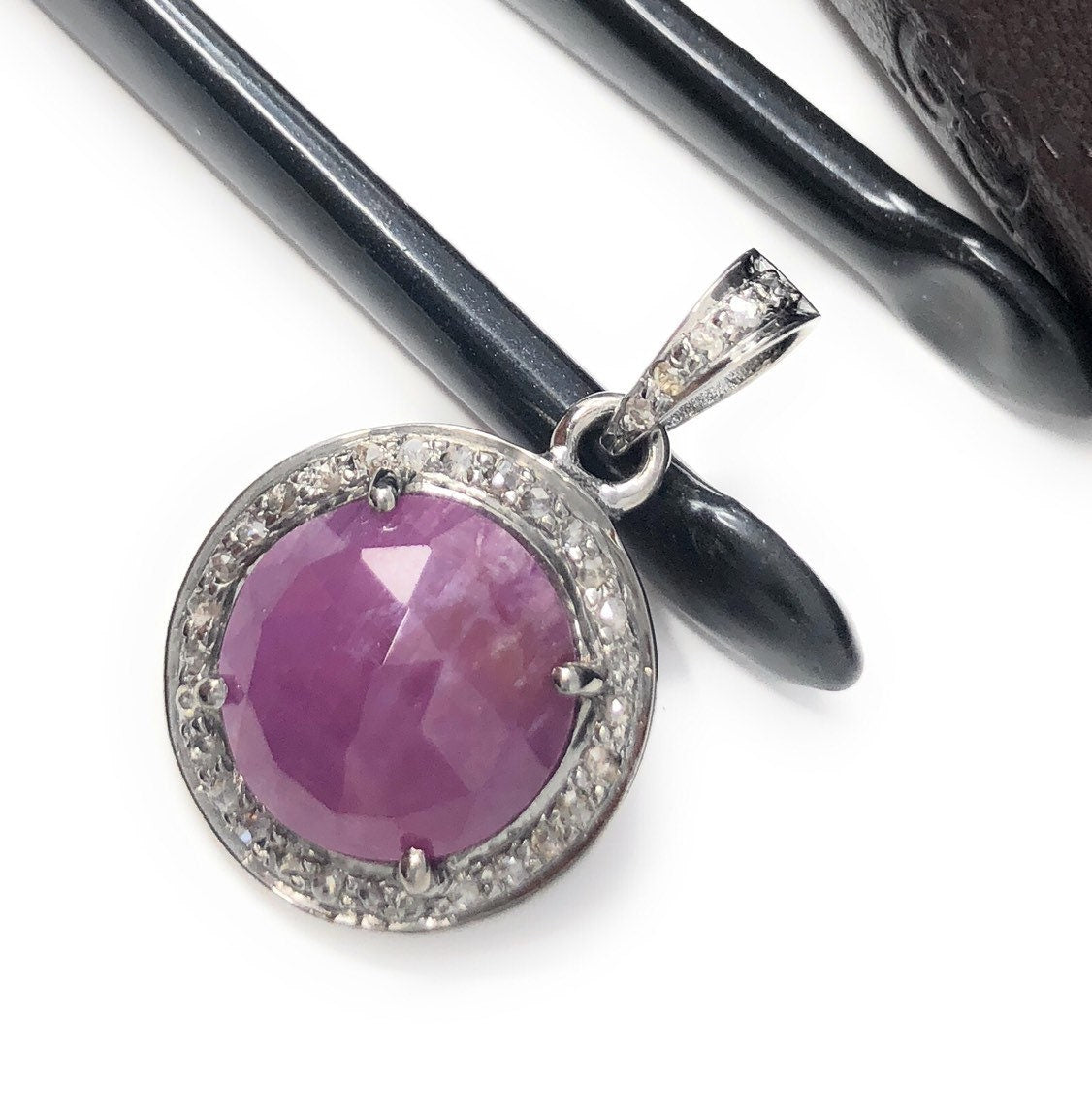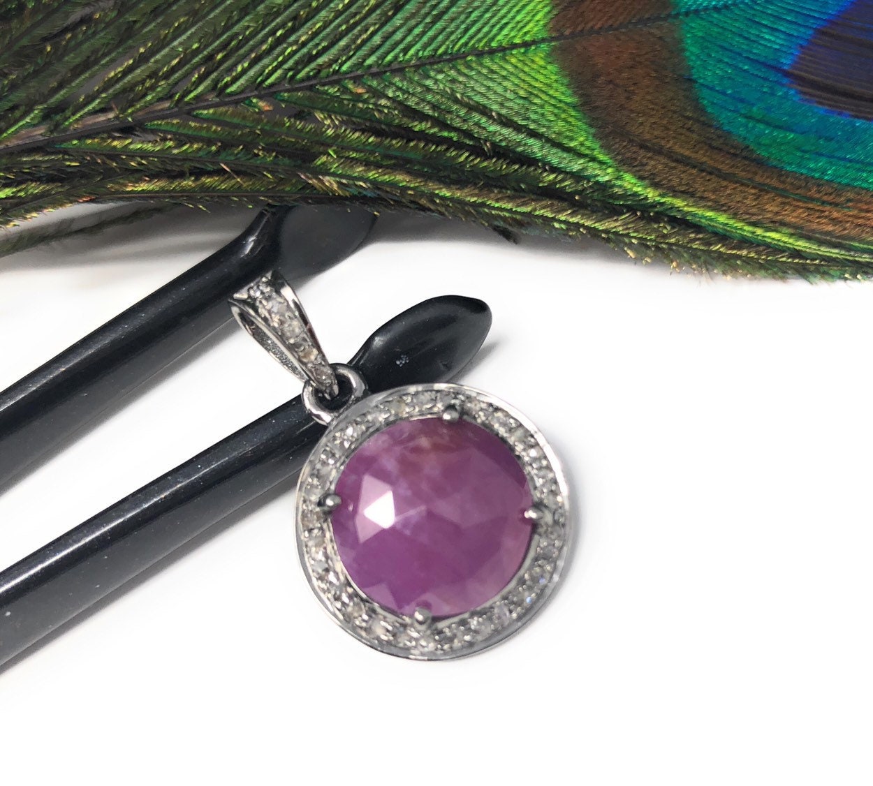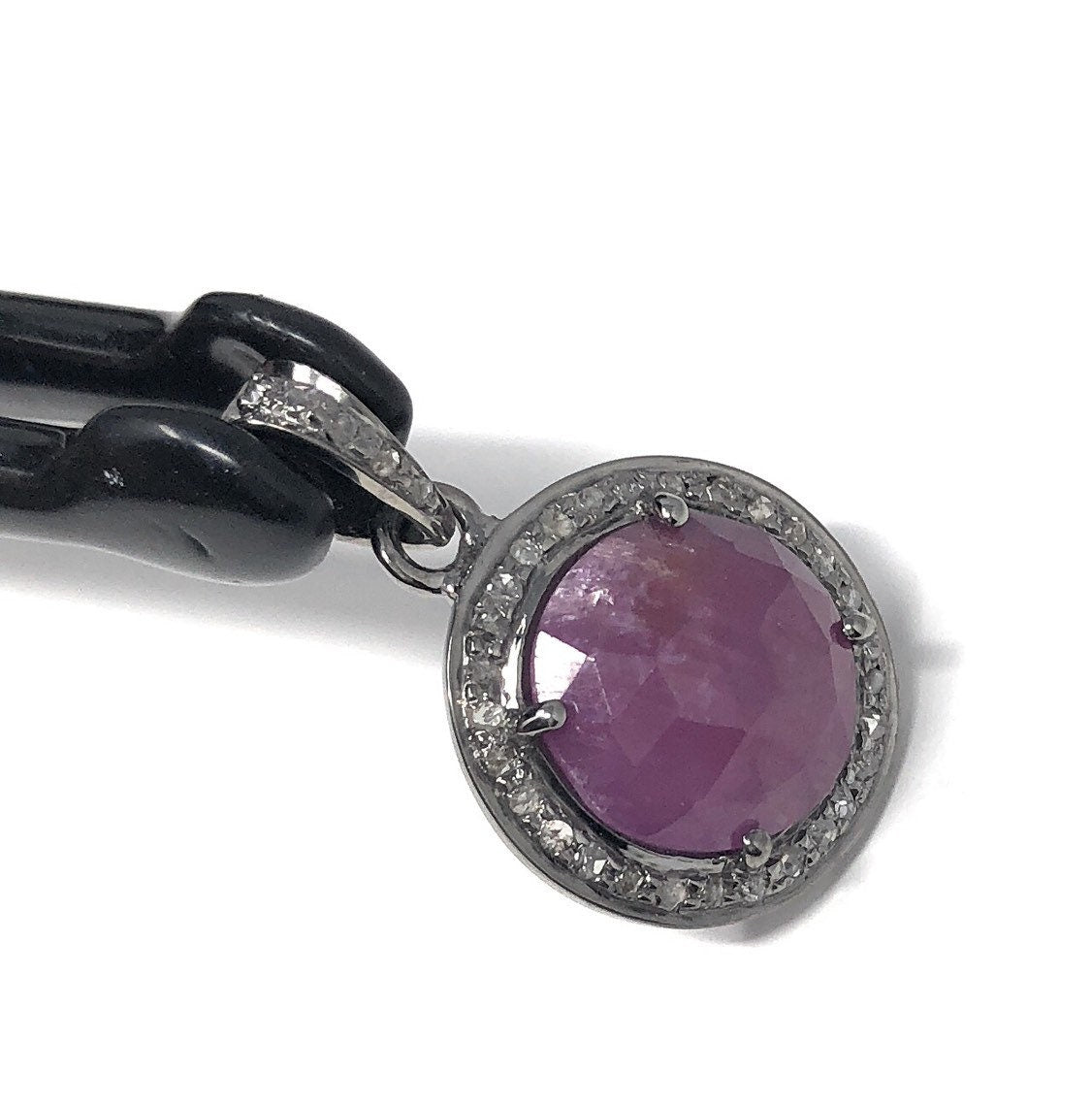 Pink Sapphire Pendant, Diamond Pendant, Silver Gemstone Pendant, Pave Diamond Pendant, Sterling Silver Pendant, Natural Sapphire Jewelry