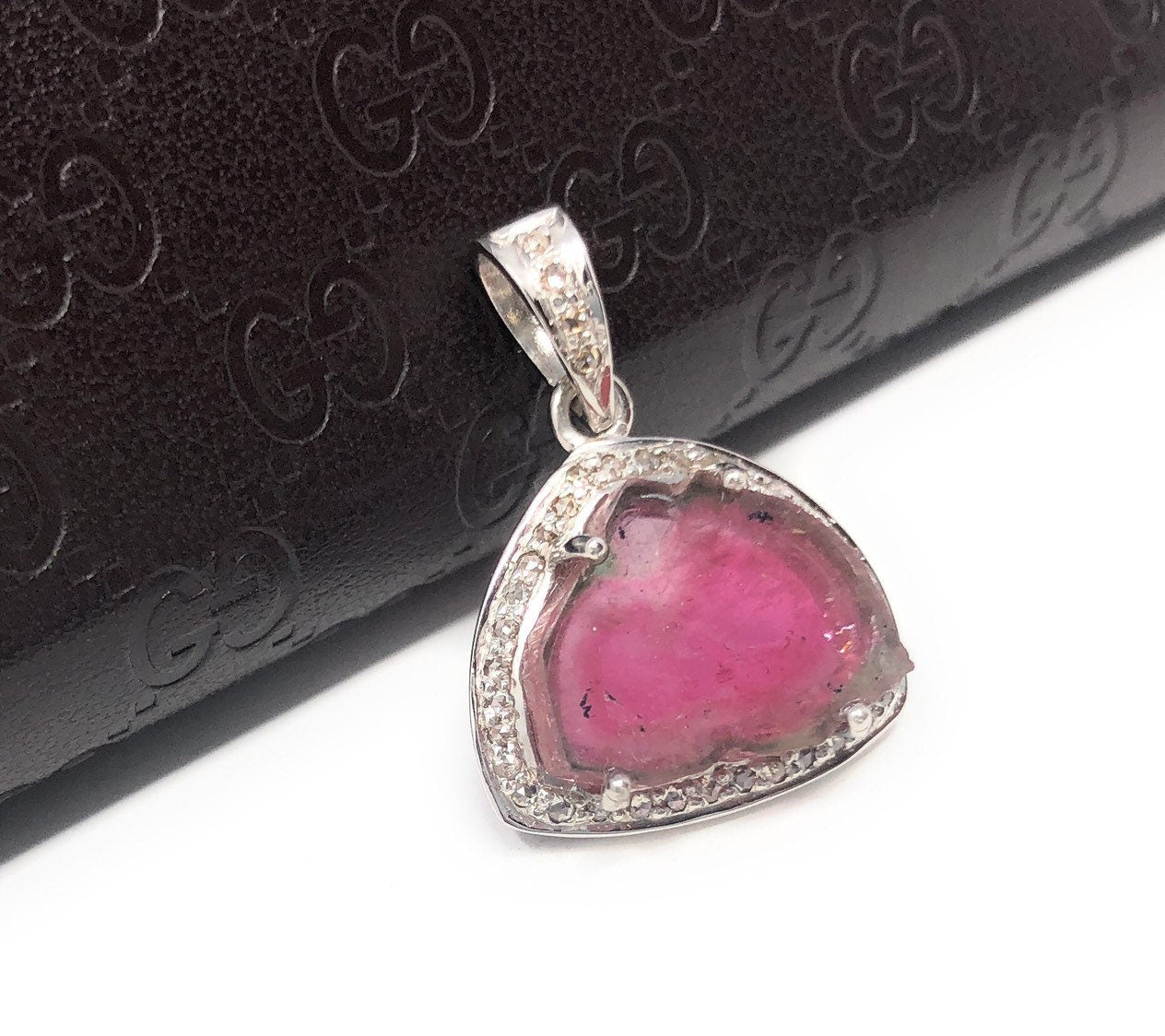 Sterling Silver Natural Watermelon Tourmaline Slice Pave Diamond Pendant at Wholesale Price .