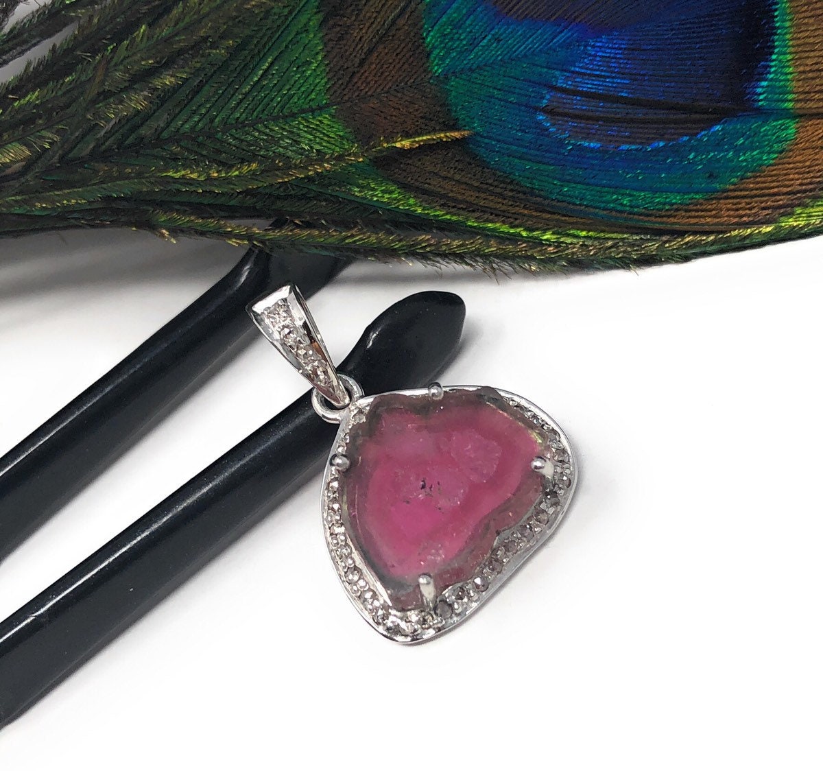 Pink Tourmaline Pendant, Gemstone Pendant, Sterling Silver Tourmaline Slice Pave Diamond Pendant, October Birthstone Jewelry