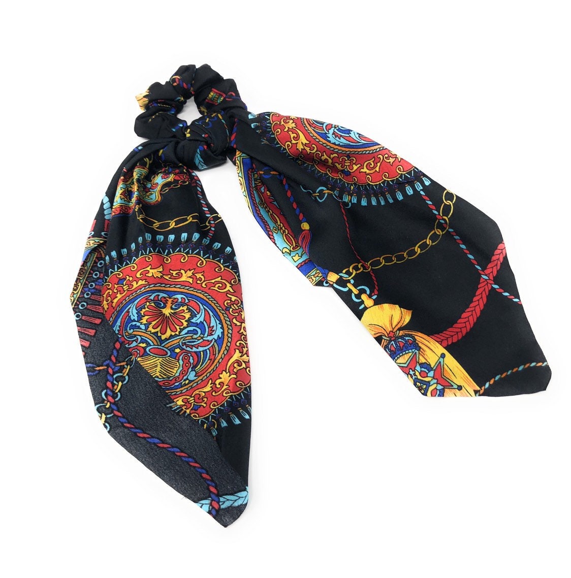 This Scrunchie is made with Elastic Scrunchie and a Long Tail Scarf tied to it. This can either be worn as just a regular scrunchie by taking off the long tail bow or can be worn with the bow and can be left as just a long tail .