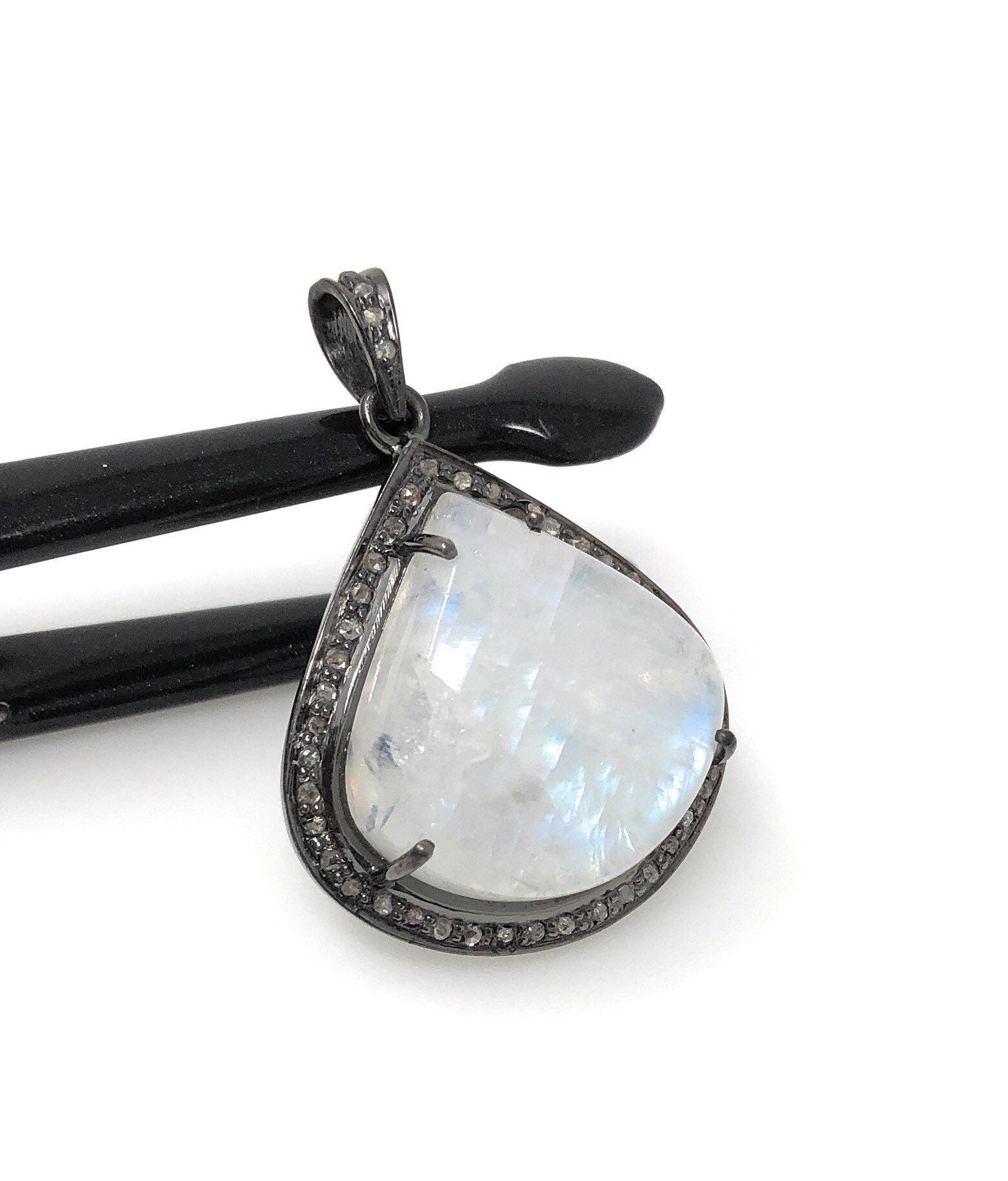 Rainbow Moonstone Gemstone Pave Diamond Sterling Silver Handmade Pendant.