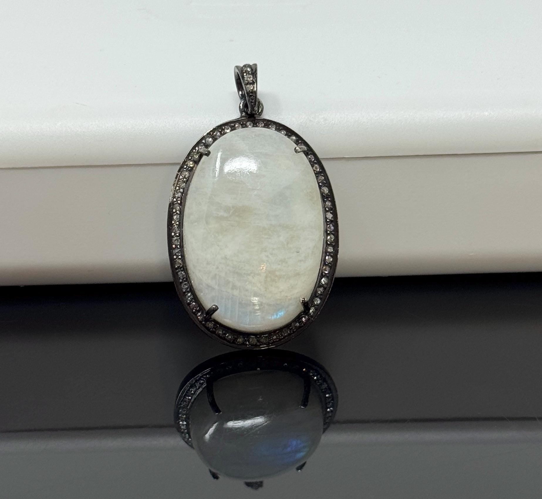 Rainbow Moonstone Pave Diamond Pendant, Silver Gemstone Pendant, Spiritual Healing Crystal Jewelry, Crown Chakra Jewelry, June Birthstone