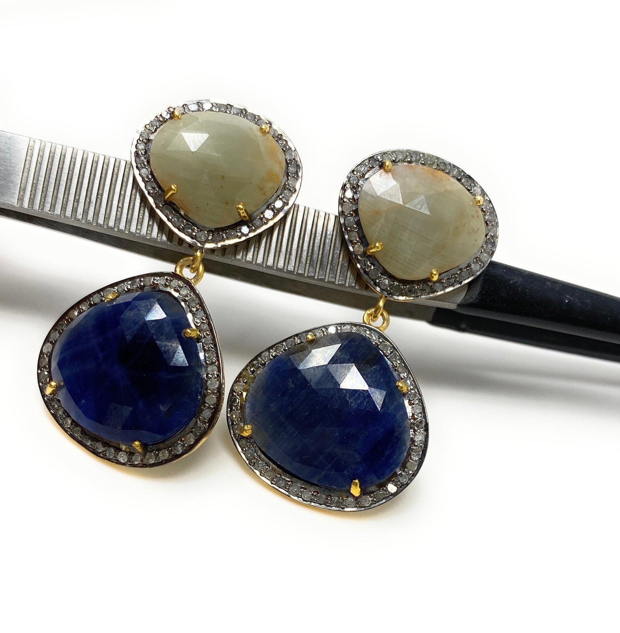 Rare Blue and Off White Sapphire Pave Diamond Earrings, Genuine Fancy Sapphire Earrings, Gemstone Jewelry , Gifts for Her