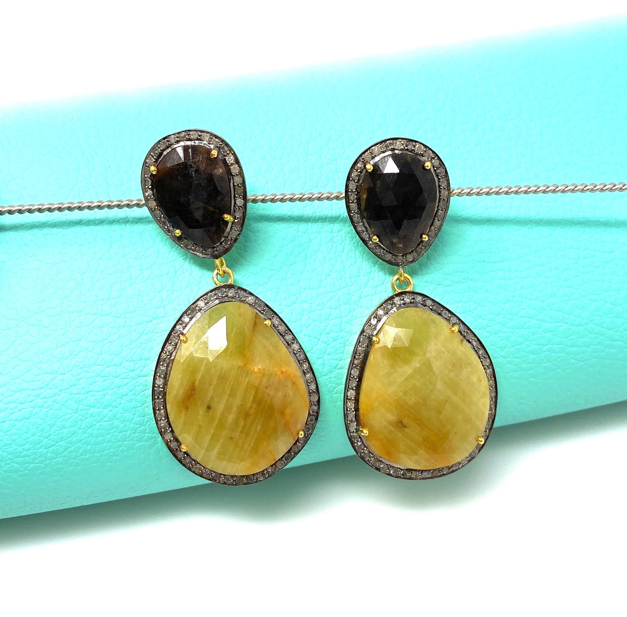 Rare Yellow Sapphire Pave Diamond Earrings, Yellow Sapphire and Smoky Fancy Sapphire Earrings, Genuine Gemstone Earrings