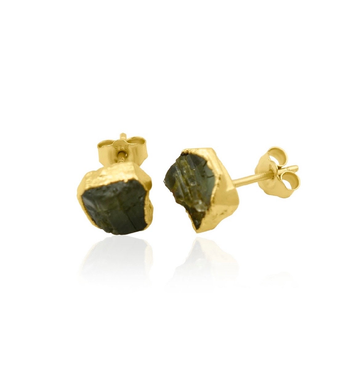 Raw Green Tourmaline Stud Earrings, Rough Gemstone Electroplated Stud Earrings, Healing Crystal Rough Gemstone Studs