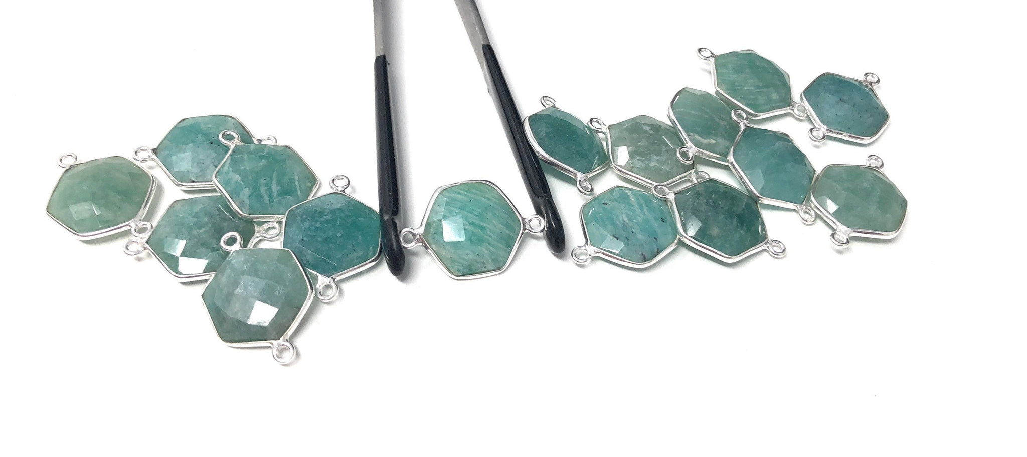 Sterling Silver Natural Gemstone Amazonite Bezel Set Double Sided Briolette Connector Jewelry Findings for Jewelry Making at Wholesale Price.
