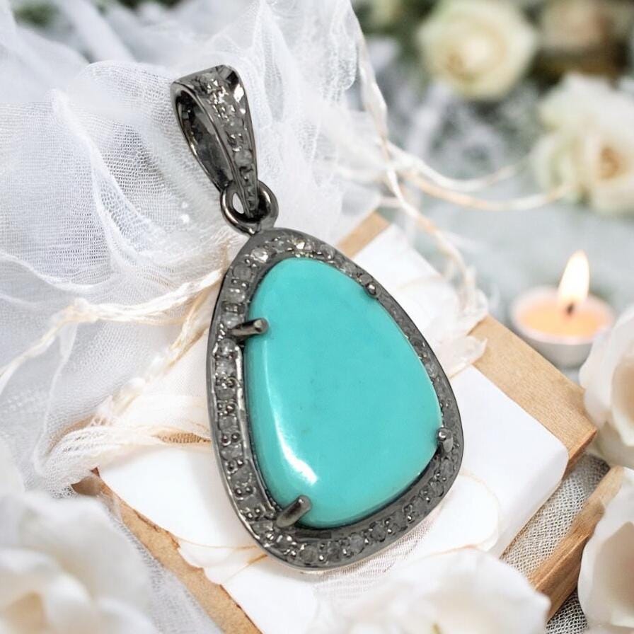 Turquoise Gemstone Pendant, Genuine Sleeping Beauty Turquoise Pave Diamond Pendant, Spiritual Healing Crystal Chakra Birthstone Jewelry