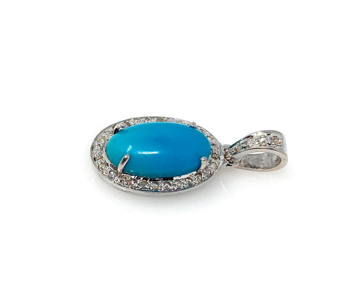 Natural Genuine Sleeping Beauty Turquoise Gemstone Sterling Silver Pave Diamond Pendant