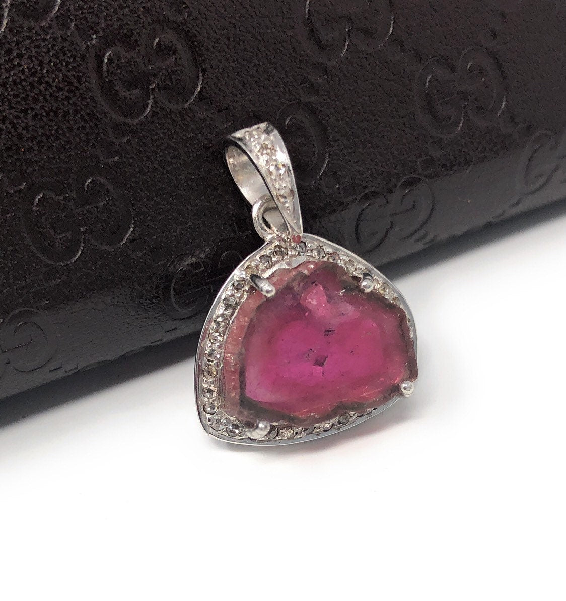 Sterling Silver Natural Watermelon Tourmaline Slice Pave Diamond Pendant at Wholesale Price .