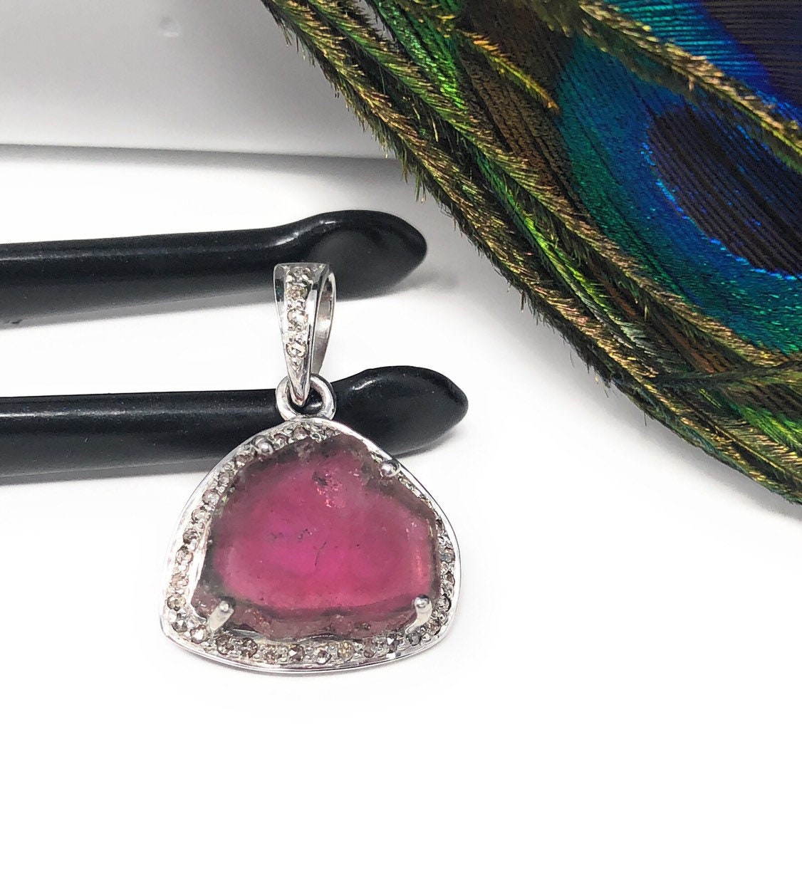 Watermelon Tourmaline Diamond Pendant, Gemstone Pendant, Sterling Silver Watermelon Tourmaline Slice Pendant, October Birthstone Jewelry