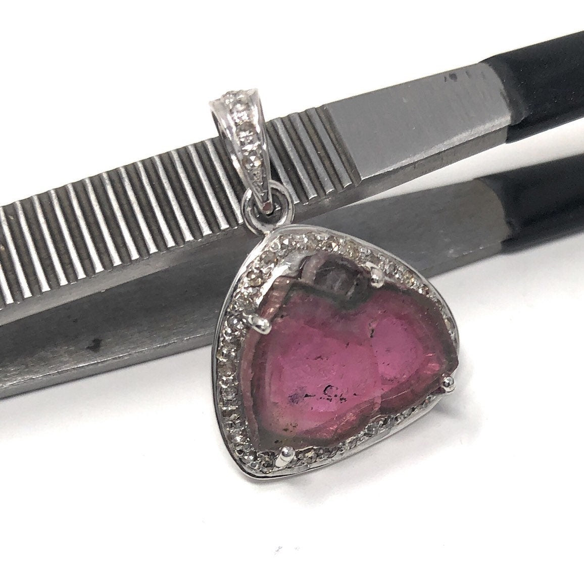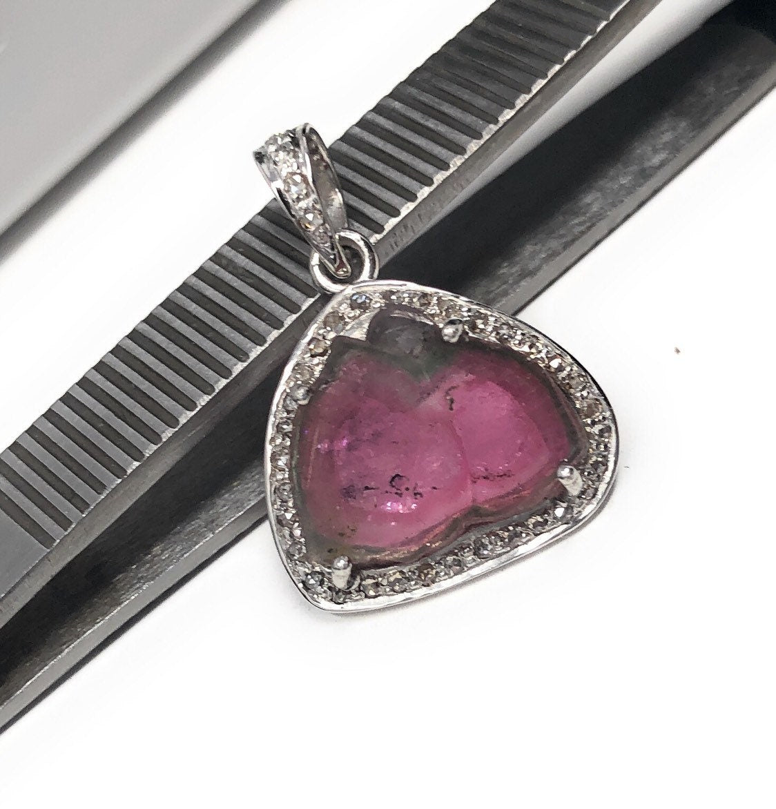 Sterling Silver Natural Watermelon Tourmaline Slice Pave Diamond Pendant at Wholesale Price .