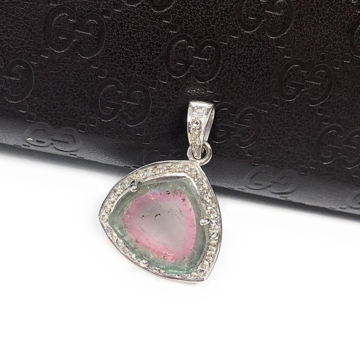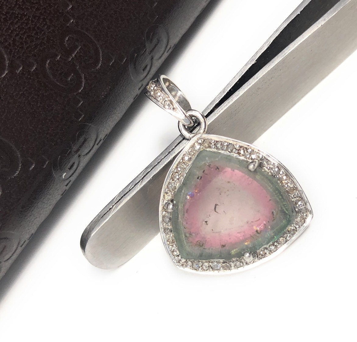 Watermelon Tourmaline Diamond Pendant, Gemstone Pendant, Sterling Silver Watermelon Tourmaline Slice Pendant, October Birthstone Jewelry