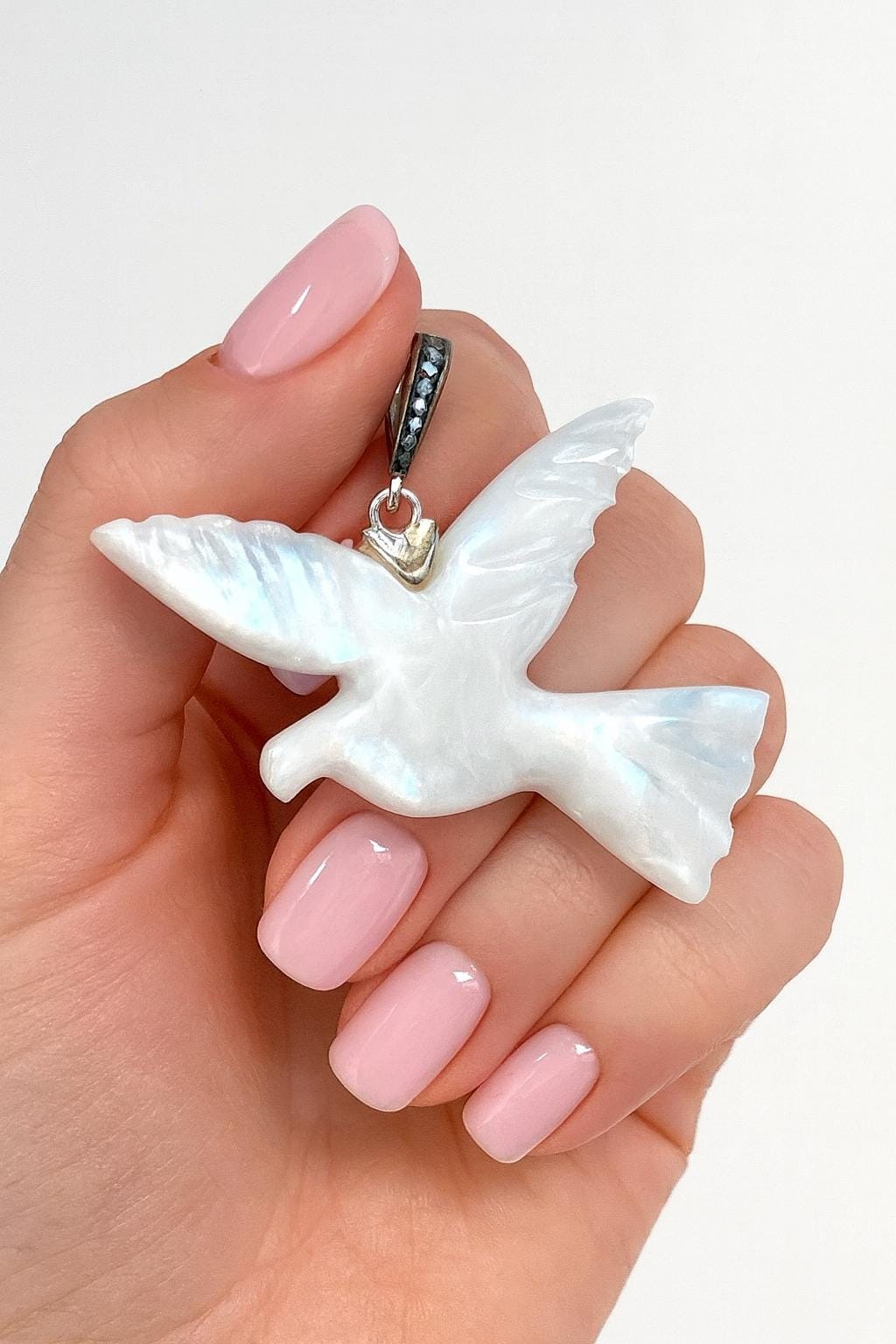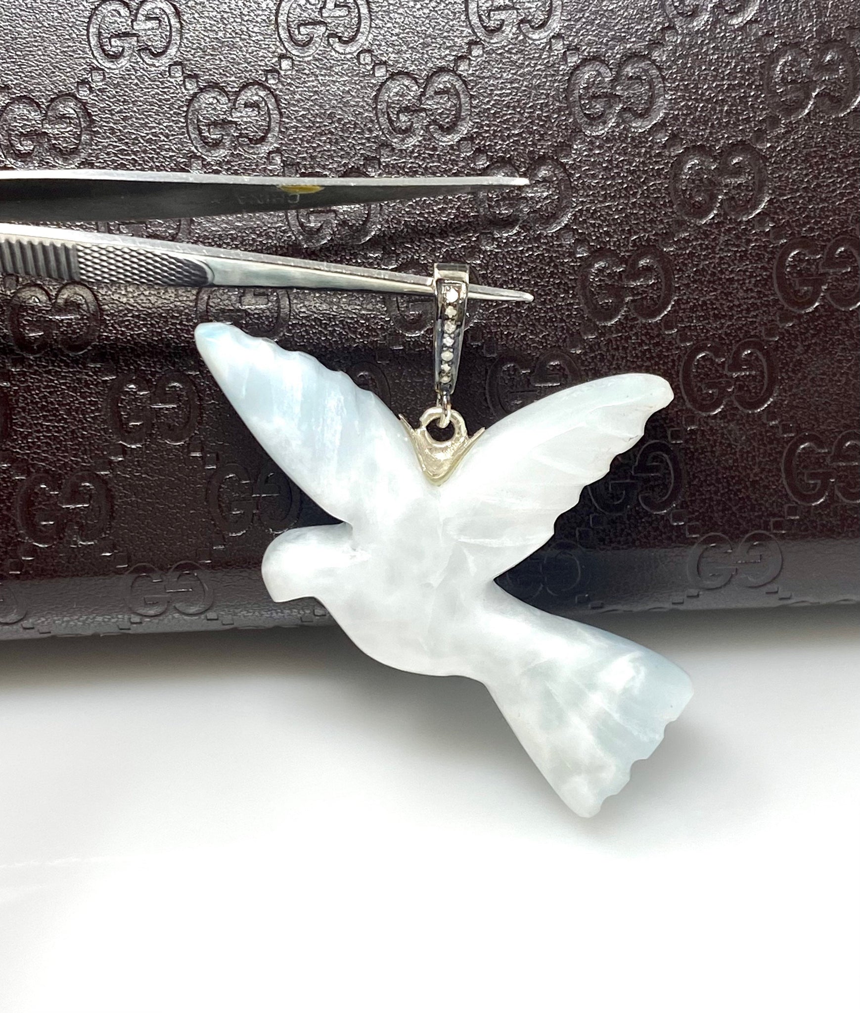 Discover the captivating beauty of the White Dove Larimar Diamond Pendant - a stunning piece of spiritual jewelry that will elevate your style and soothe your soul.