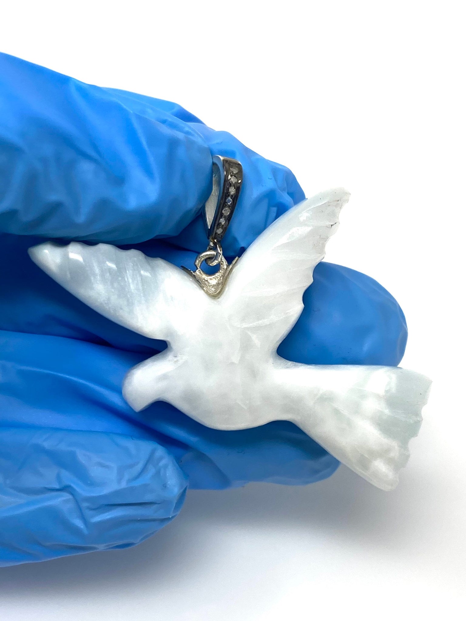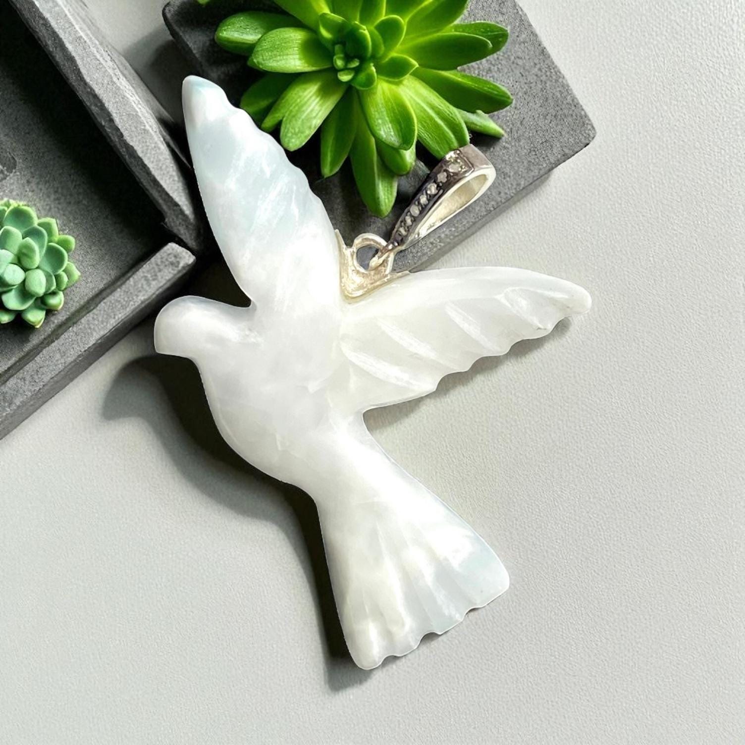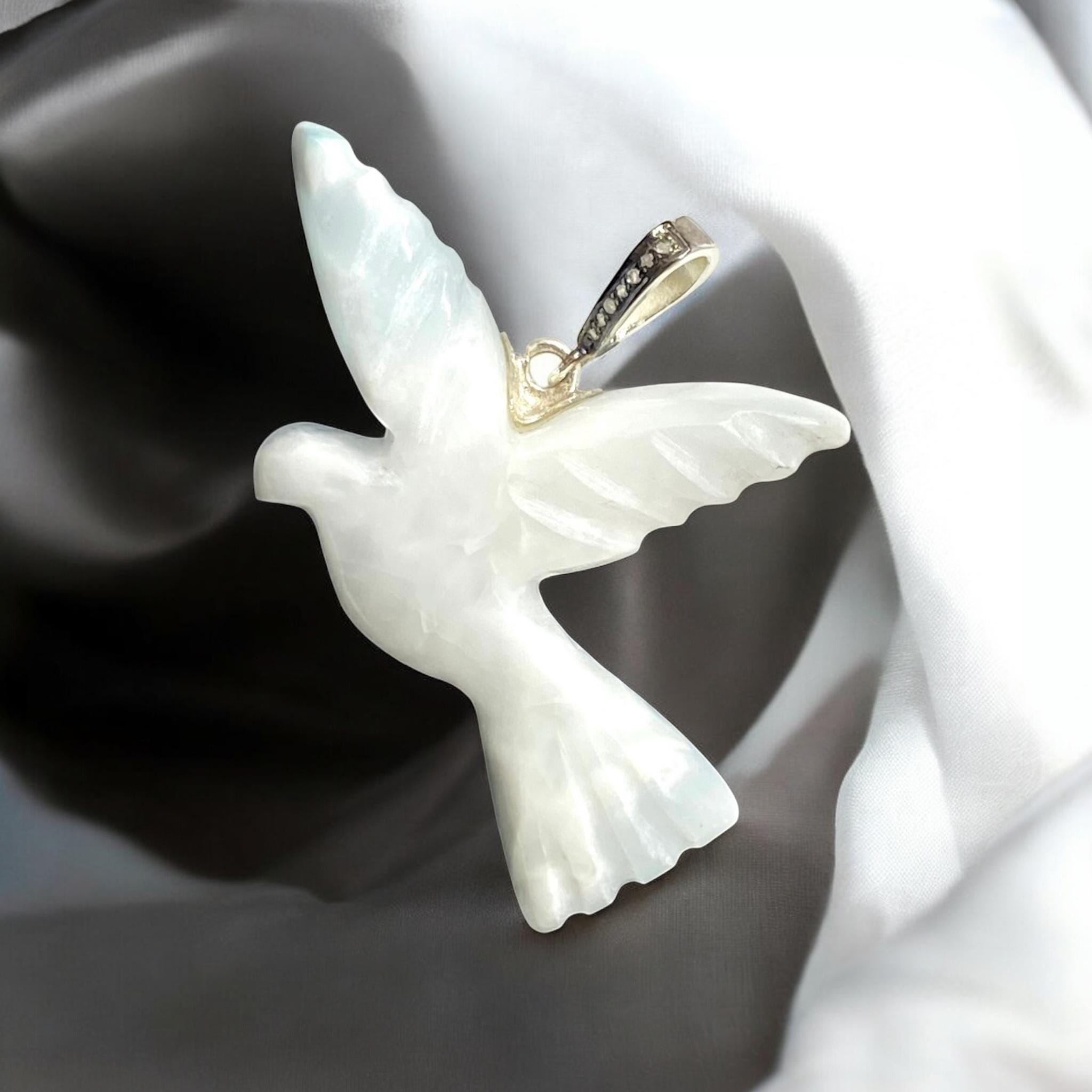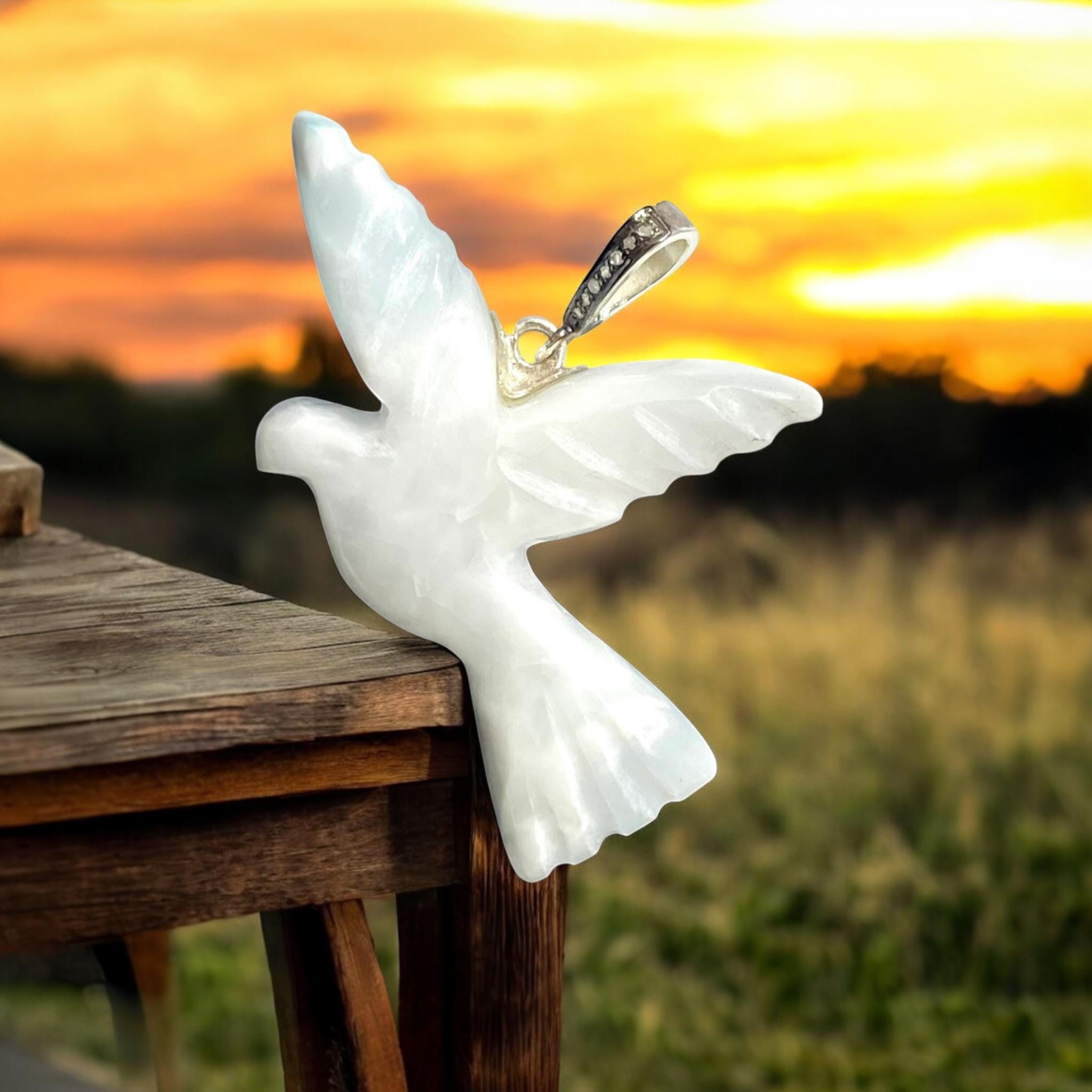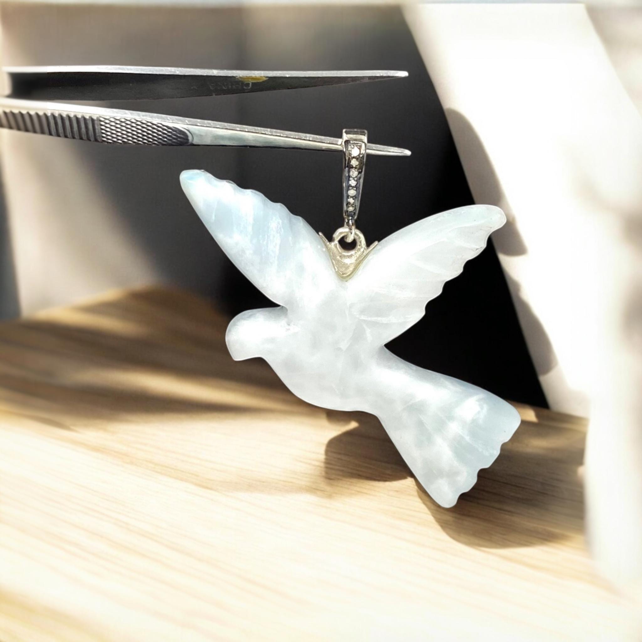This exquisite pendant is more than just a piece of jewelry - it's a talisman that connects you to the divine. The soothing blue hues of larimar are said to calm the mind and open the heart, while the white dove bird symbolizes freedom, peace, and the power of the spirit. Wear it as a daily reminder to embrace your own inner light and let your soul soar.