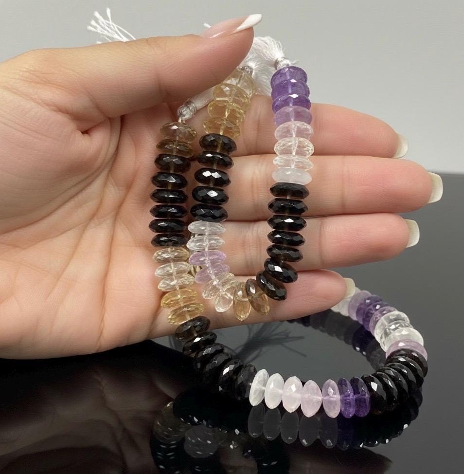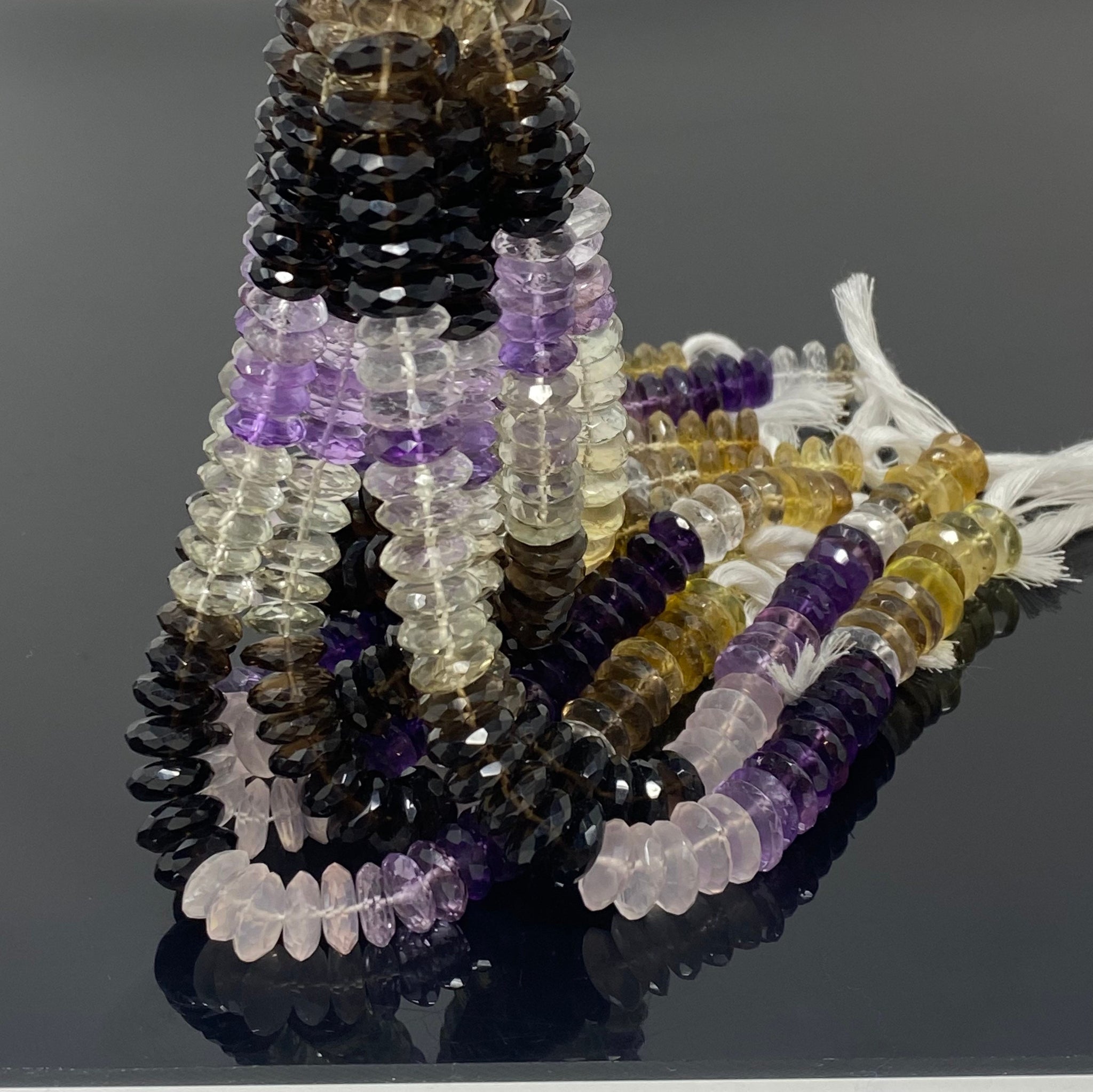 8" Natural Multi Stone German Cut Gemstone Beads - Rose Quartz/ Amethyst/ Citrine / Smokey Quartz/ Green Amethyst, Spiritual Healing Crystal
