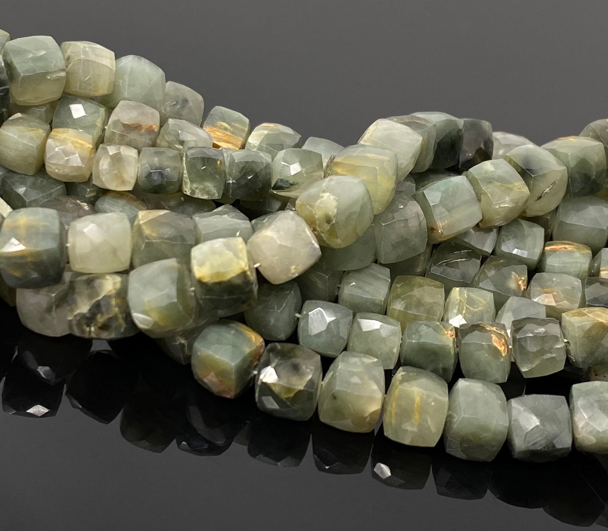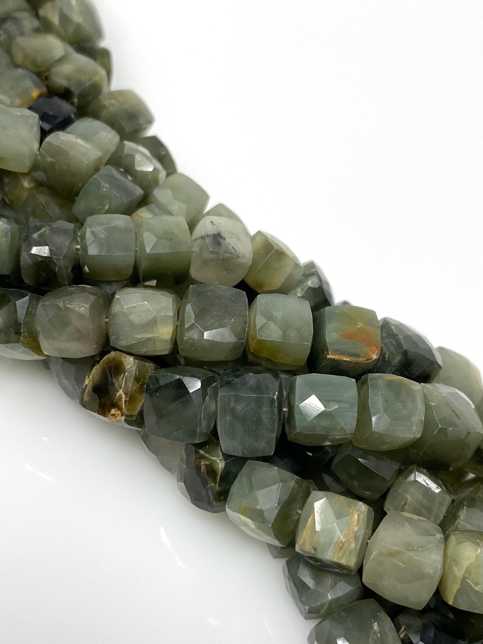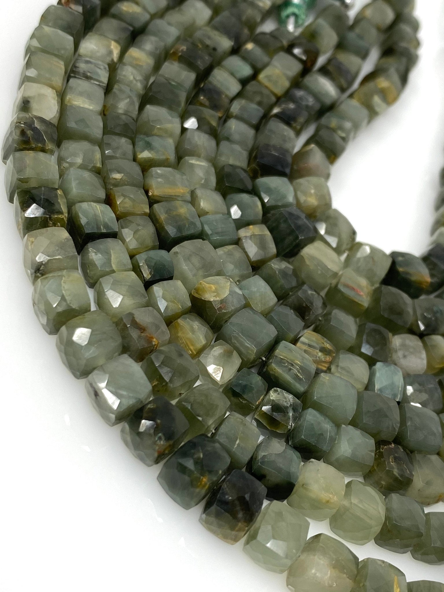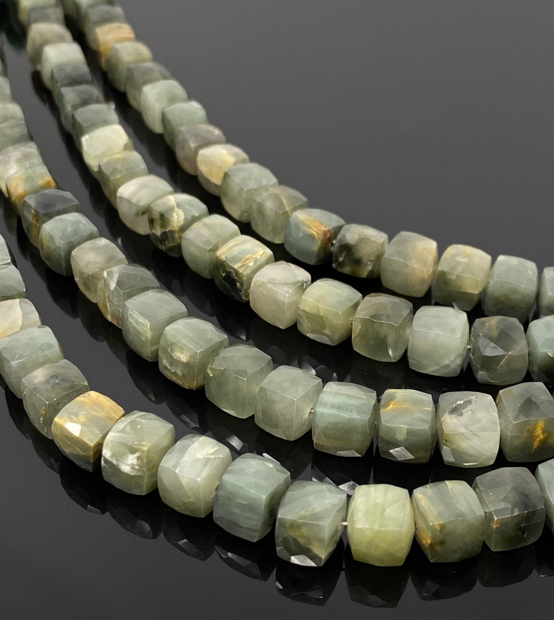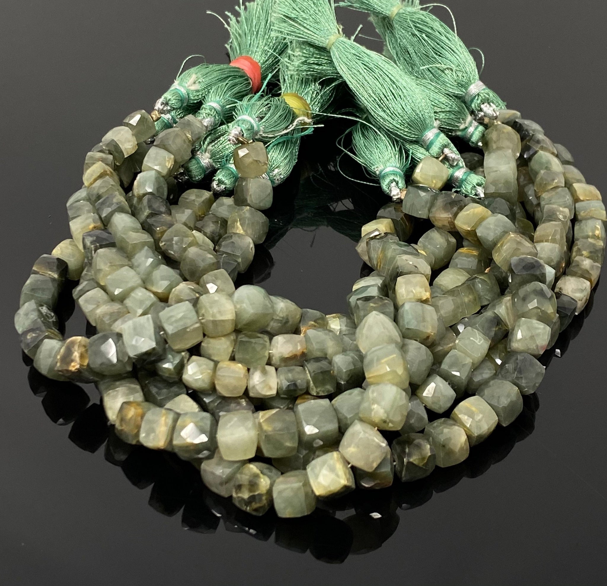 Cats Eye Gemstone Beads, Natural Chrysoberyl Green Cats Eye Beads, 3D Cube Box Beads, Bulk Wholesale Beads, Jewelry Supplies, 8" Strand