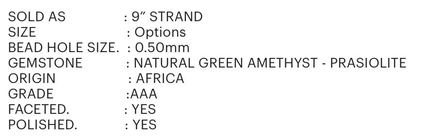 These Beautiful 100% Natural Genuine Untreated AAA Grade Polished Faceted Green Amethyst Prasiolite Beads are great for making Necklace or can be used for bracelets or Beaded Earrings. These can be used in multiple ways to bring out the creativity of the maker.