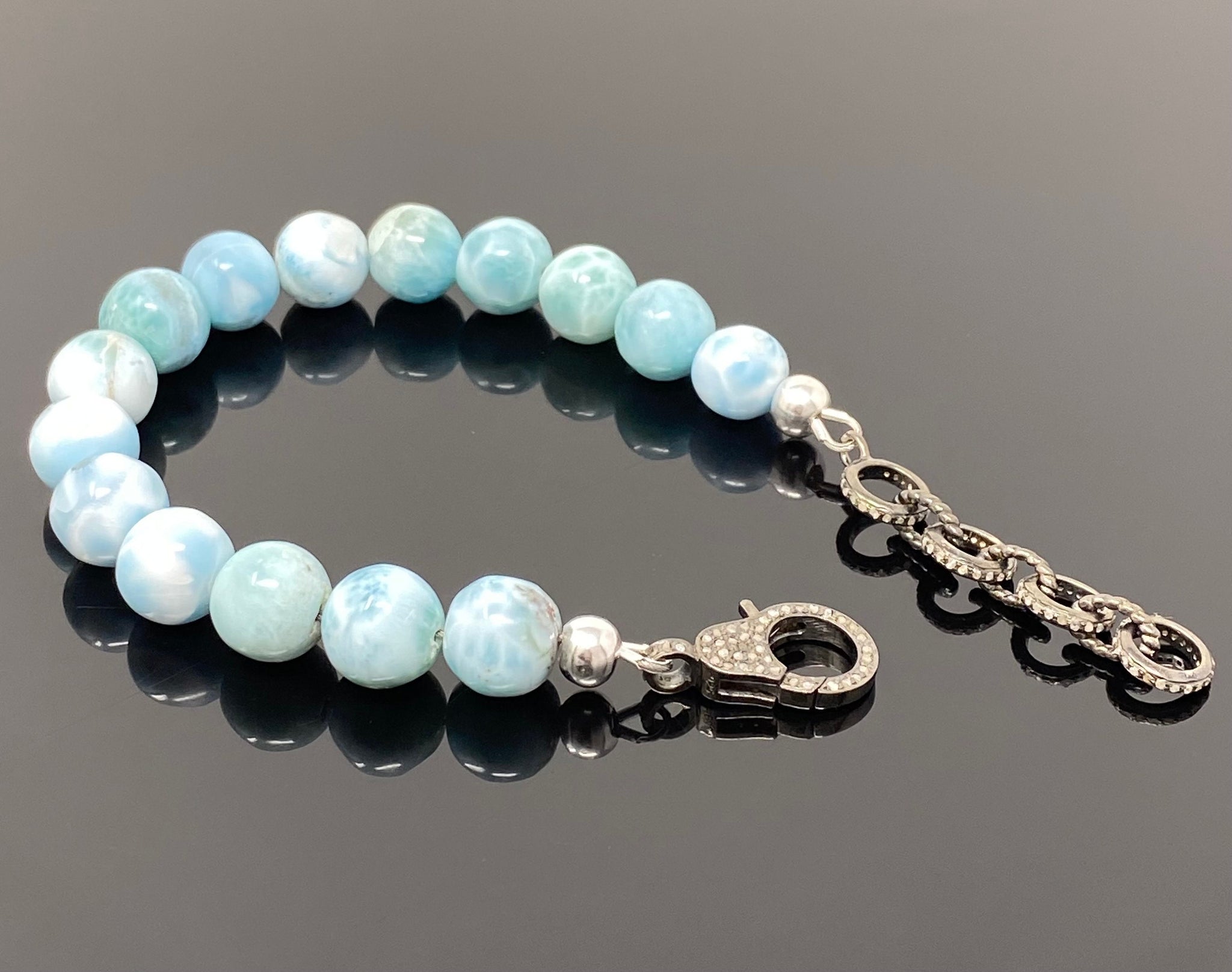 10mm Genuine Larimar Gemstone Bracelet, Pave Diamond Adjustable Bracelet, Dominican Republic Larimar Jewelry