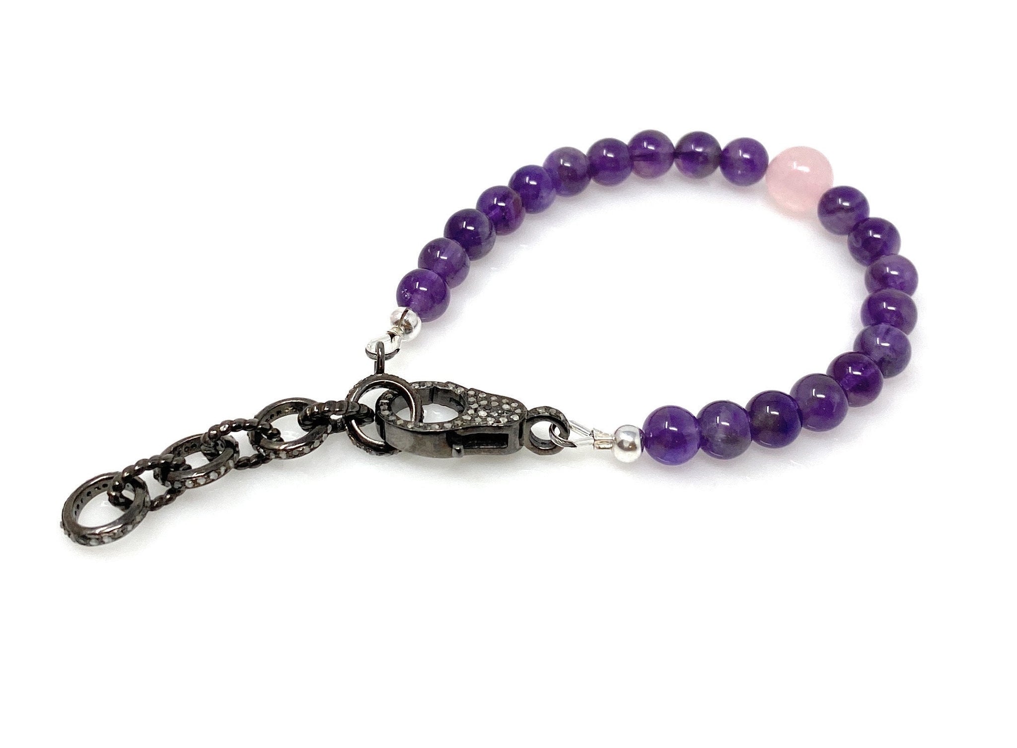 Natural Amethsyt and Rose Quartz Gemstone Bracelet, Pave Diamond Adjustable Bracelet, AAA Grade, Gifts for Her