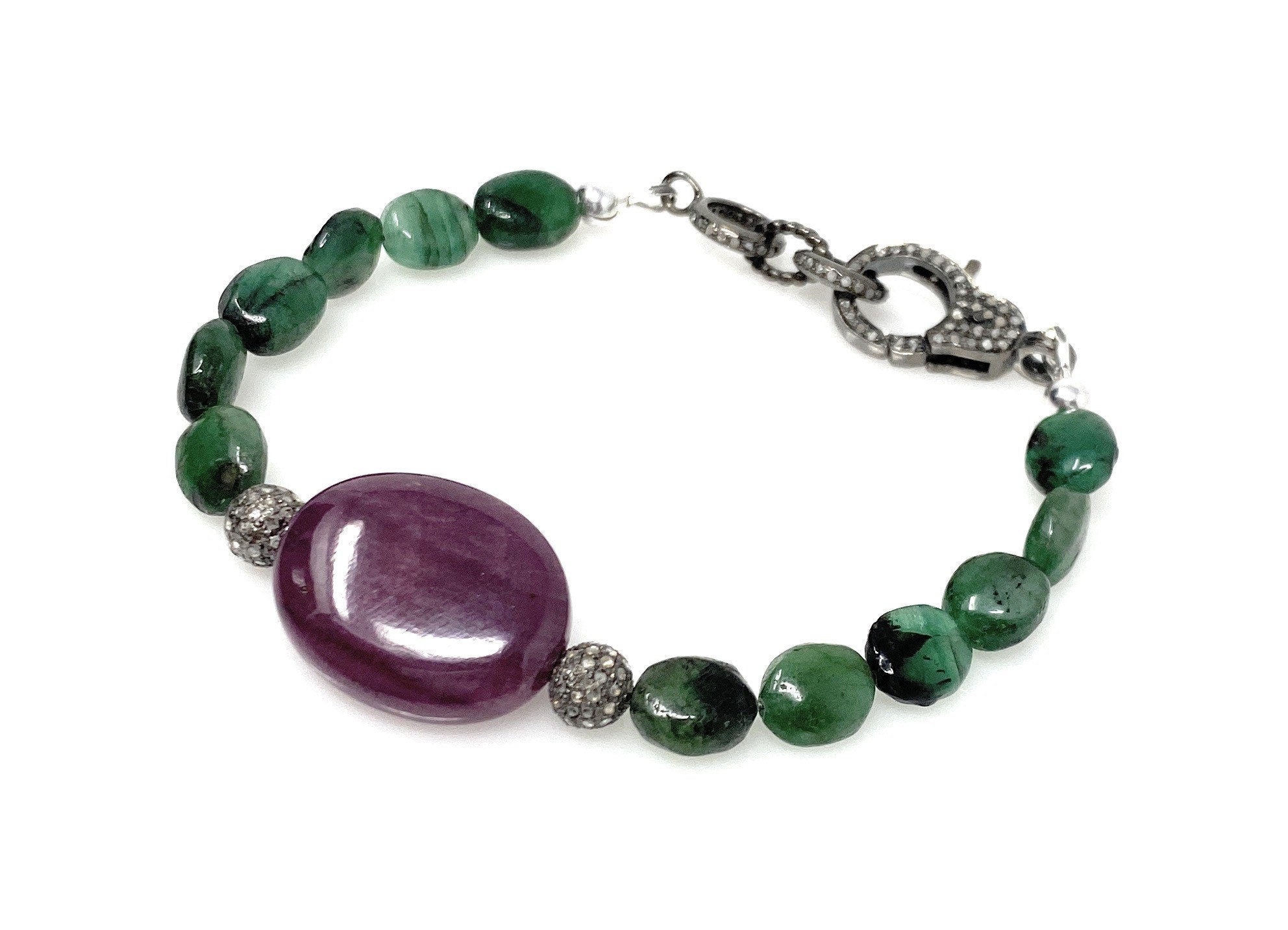 This beautiful Handmade AAA Grade Natural Ruby and Emerald Nugget Gemstone Beads Sterling Silver Pave Diamond Adjustable Bracelet is made by using large Ruby piece in center with Genuine Diamond Beads on the side with Smooth Emerald Nugget Beads .