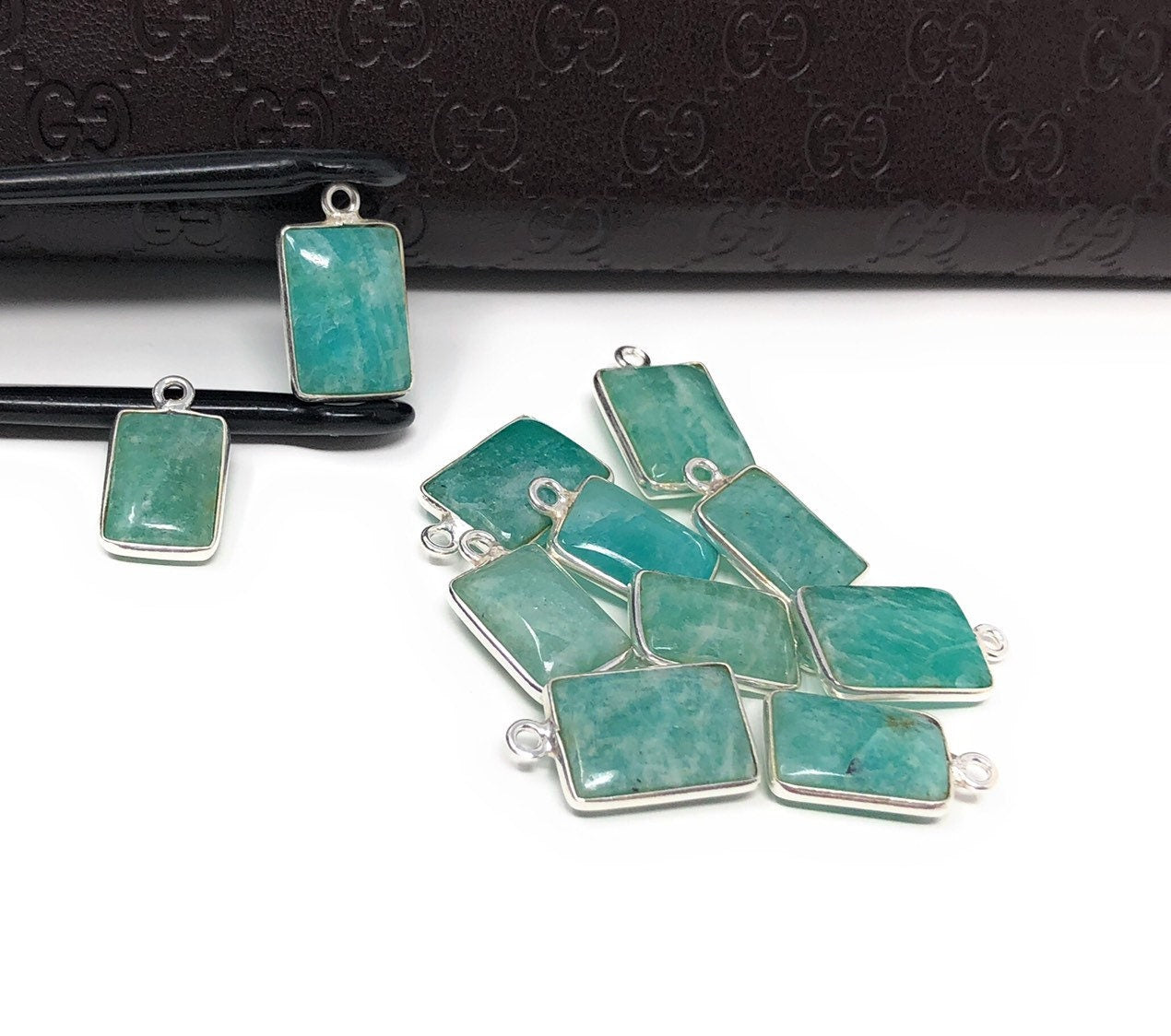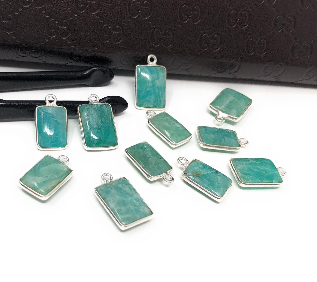 11Pcs Sterling Silver Natural Gemstone Amazonite Bezel Set Double Sided Briolette Charm Jewelry Findings for Jewelry Making at Wholesale Price.