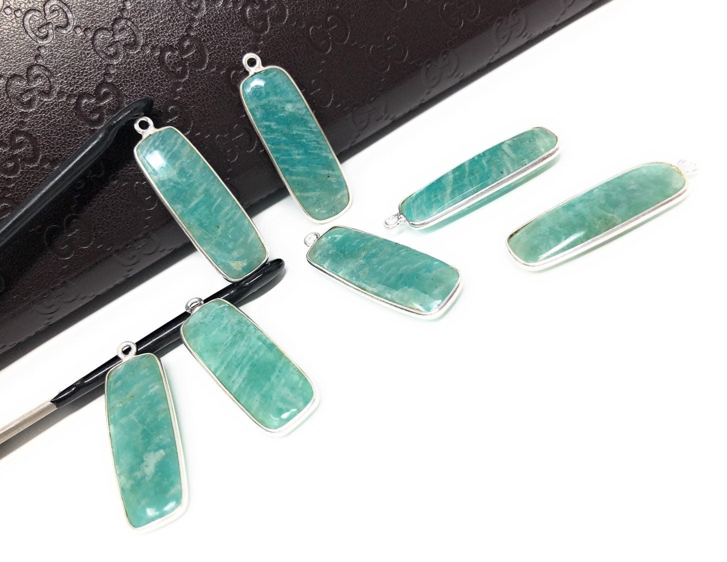 5 Pcs Sterling Silver Natural Gemstone Amazonite Bezel Set Double Sided Briolette Bar Charm Jewelry Findings for Jewelry Making at Wholesale Price.