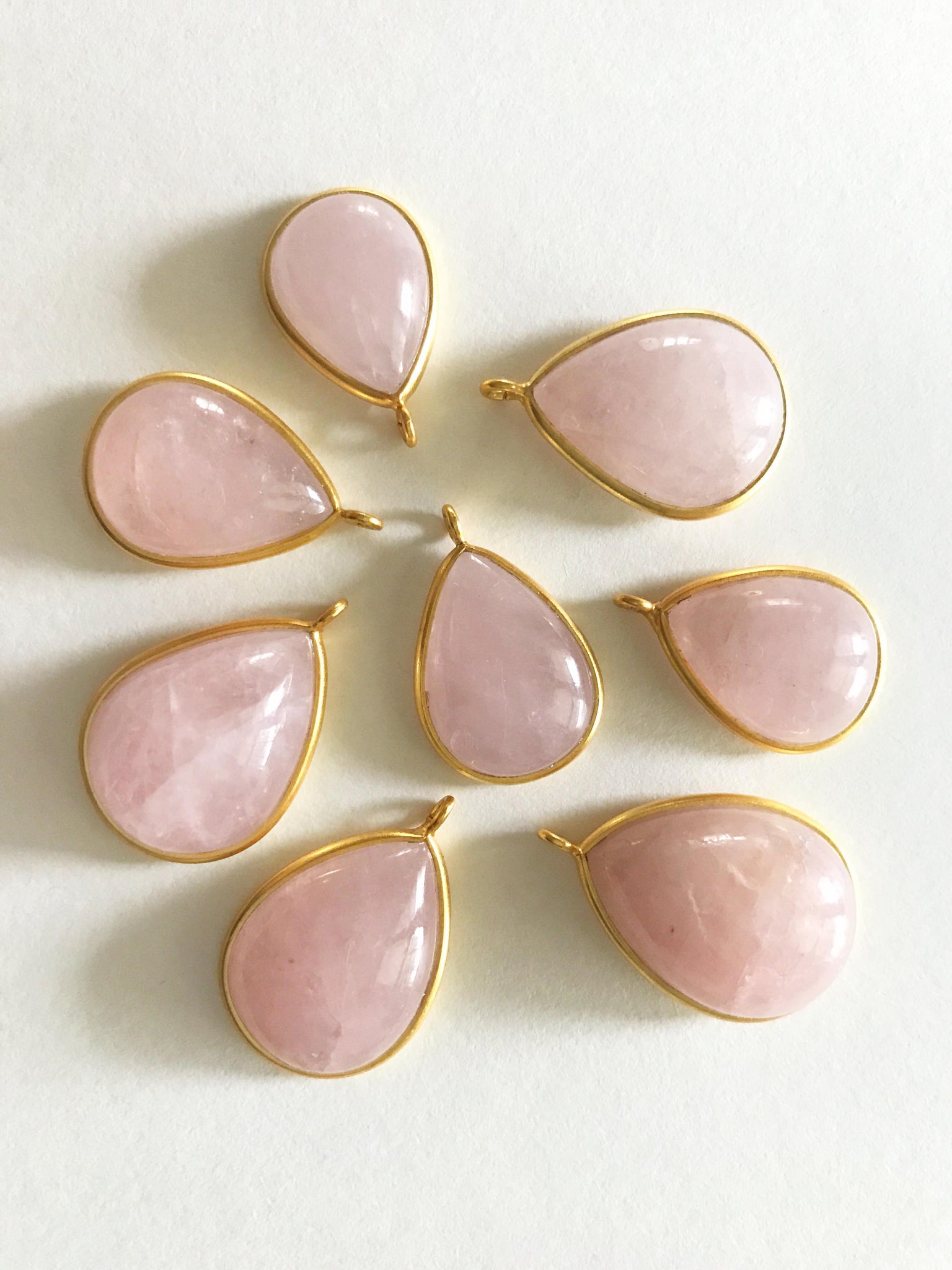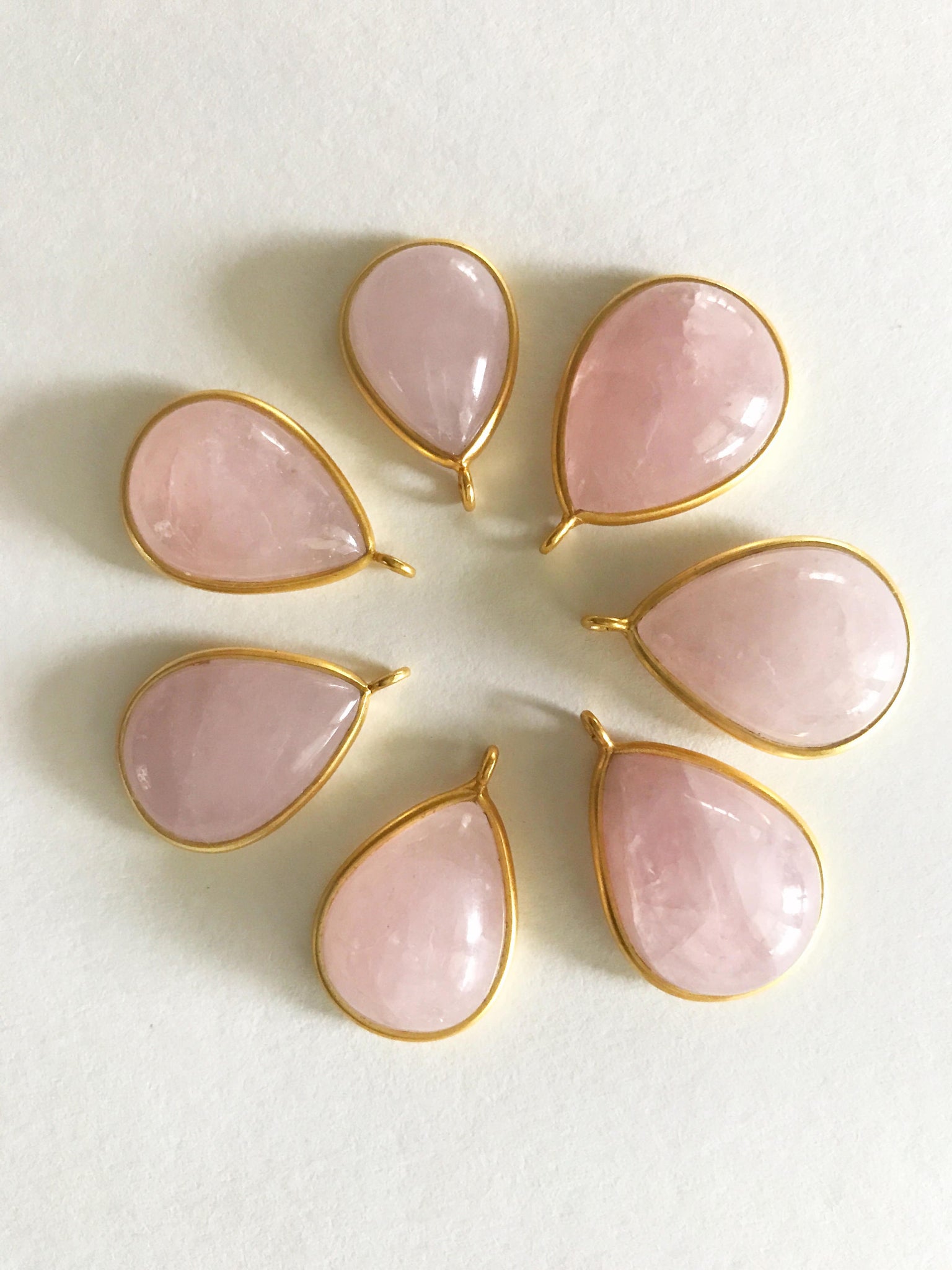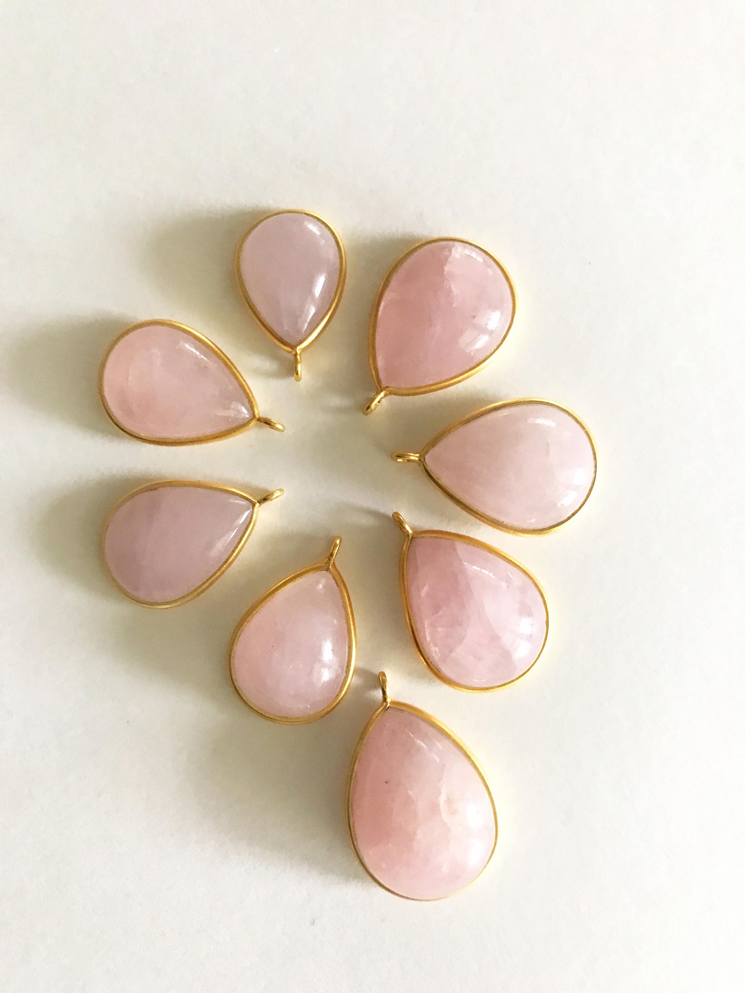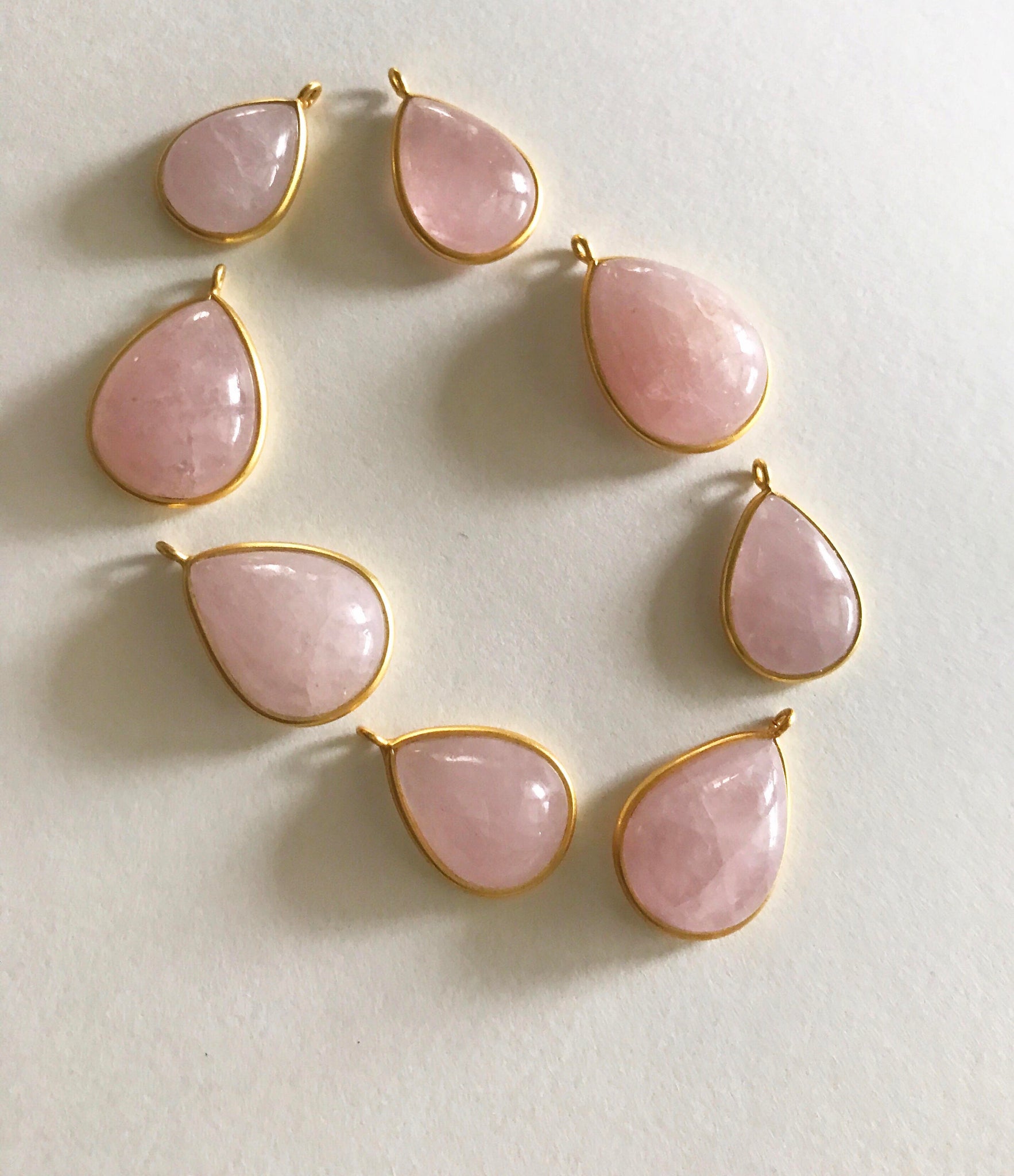 14K Gold Plated over 925 Sterling Silver Natural Gemstone Morganite Cabochon Drop Shape Bezel Charm for Jewelry Making at Wholesale Price.