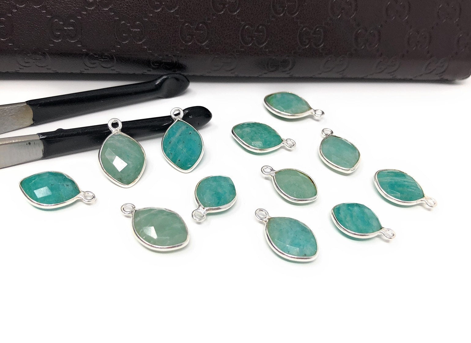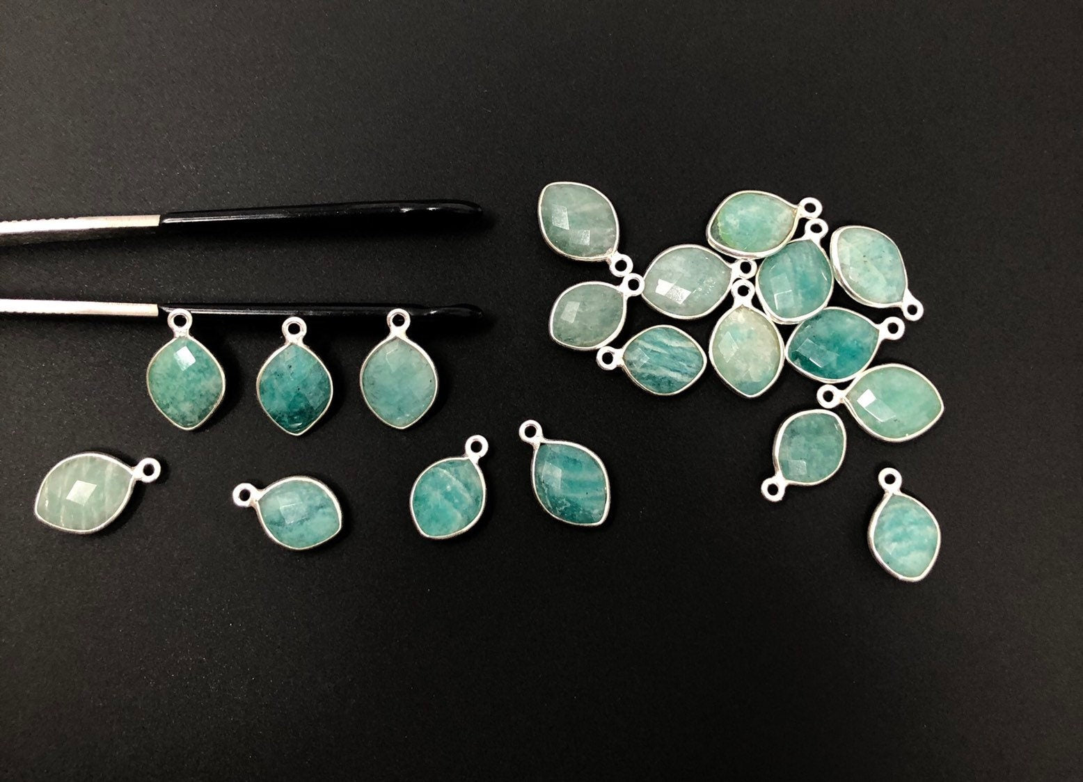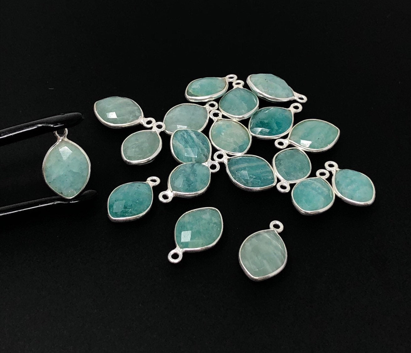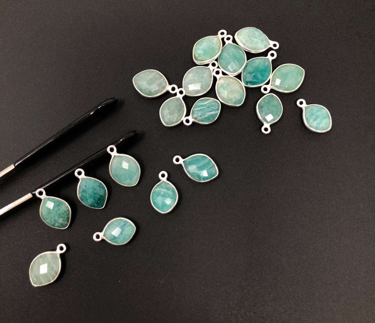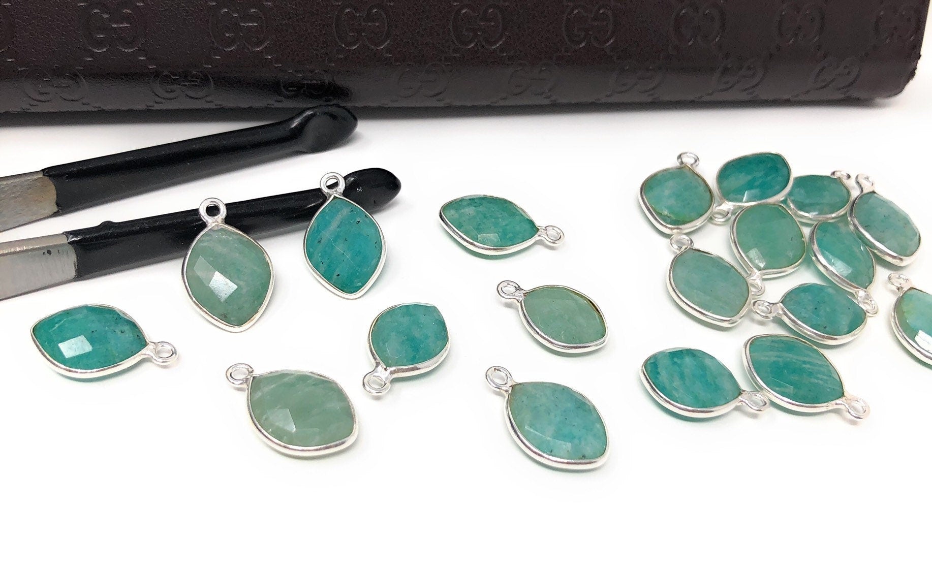 Sterling Silver Natural Gemstone Amazonite Bezel Set Double Sided Briolette Charm Jewelry Findings for Jewelry Making at Wholesale Price.