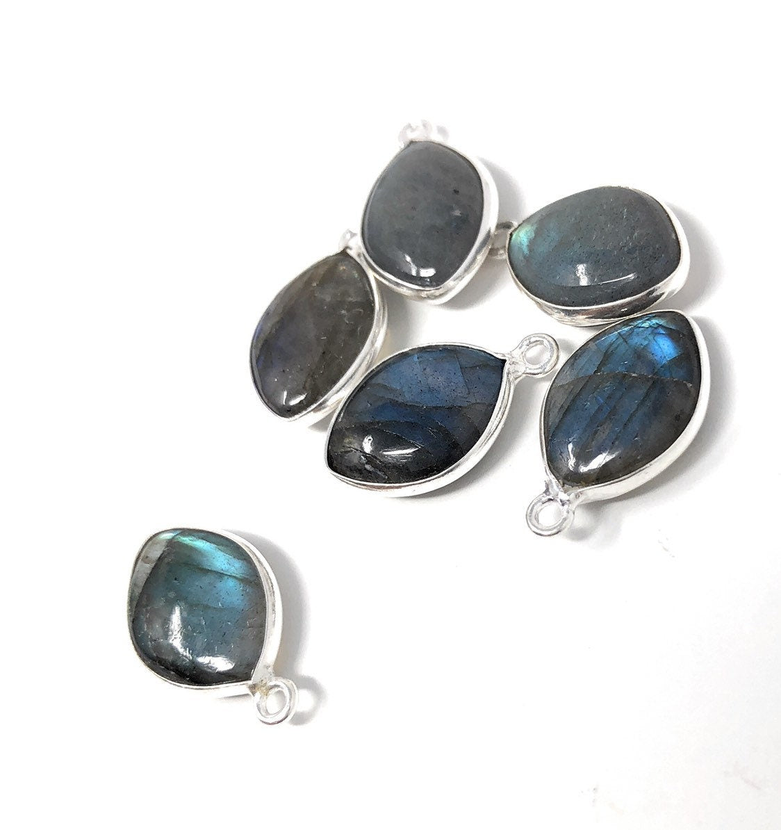 Wholesale 6 Pcs Labradorite Gemstone Charms, Sterling Silver Briolette Charms, Jewelry Findings, Jewelry Making, Jewelry Supplies, 17.5x11mm