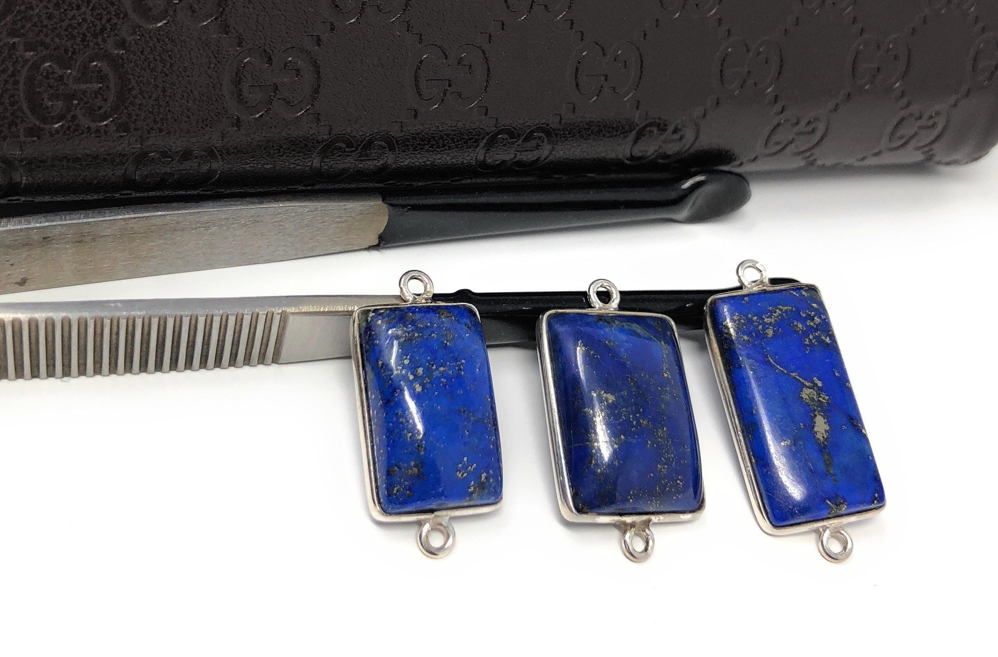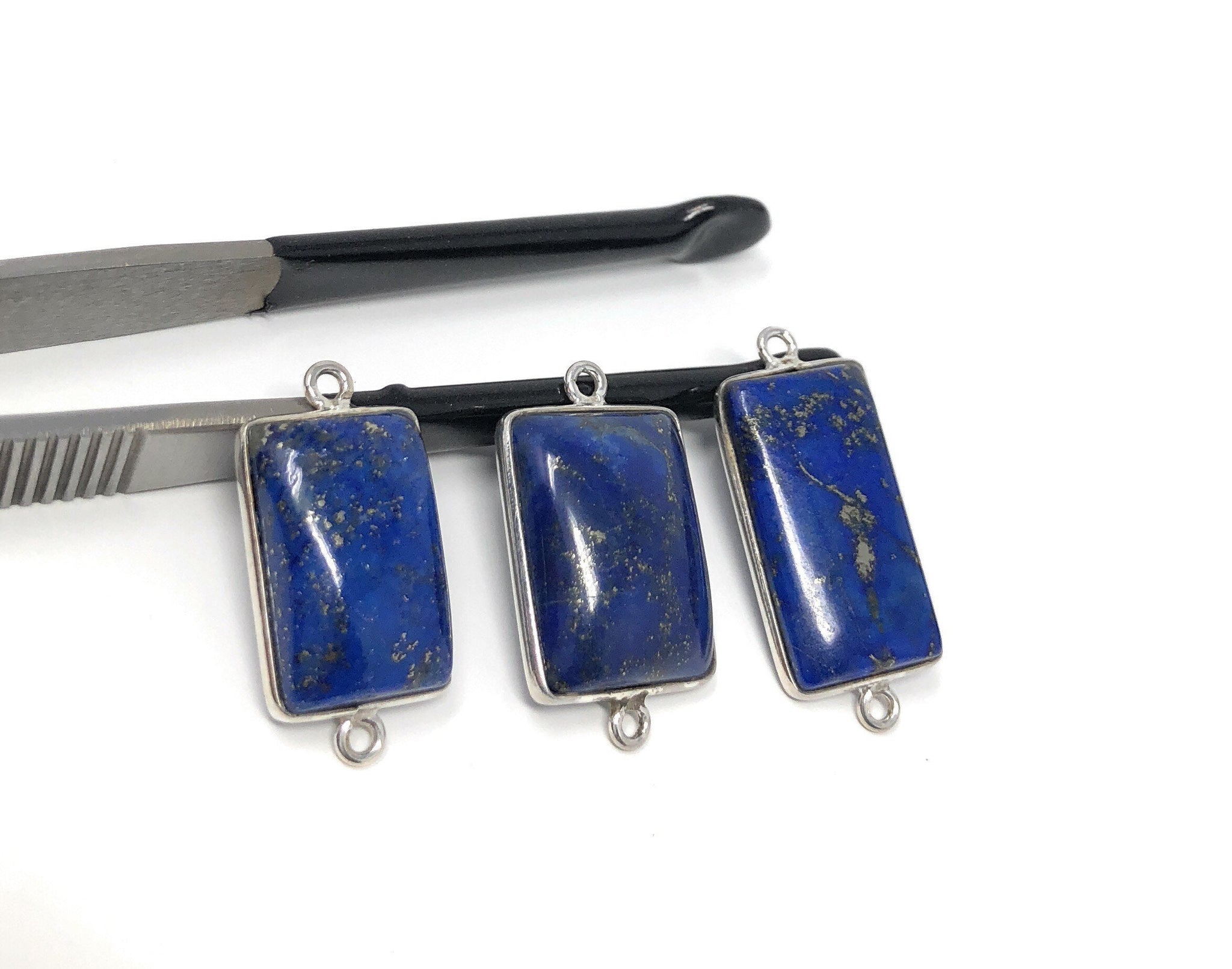 This Beautiful Bulk lot of 3 Pieces of Handmade 925 Sterling Silver Rectangle Shape Natural Smooth Polished Lapis Lazuli Gemstone Charm Connectors is an excellent choice for making any Jewelry Design. These can be used for making Charm Bracelet, Pendant Necklace or can be used to make any creative Jewelry Design.