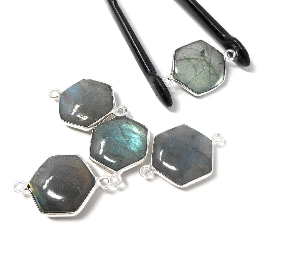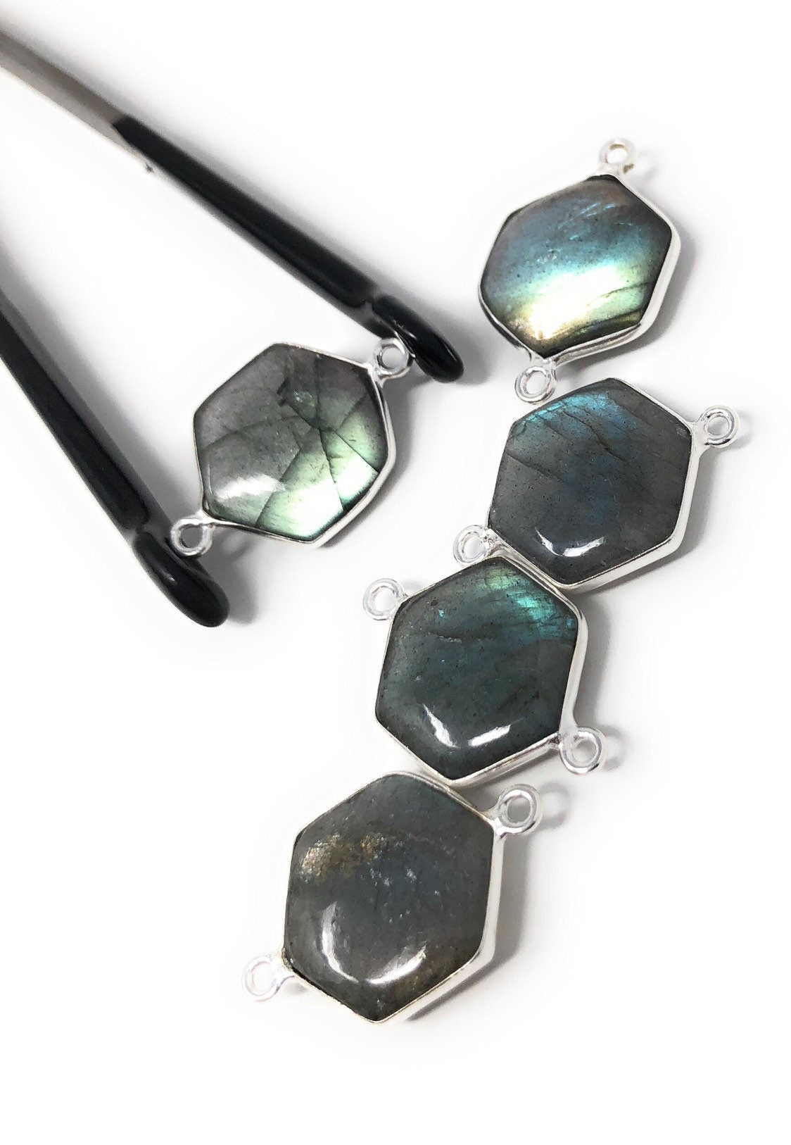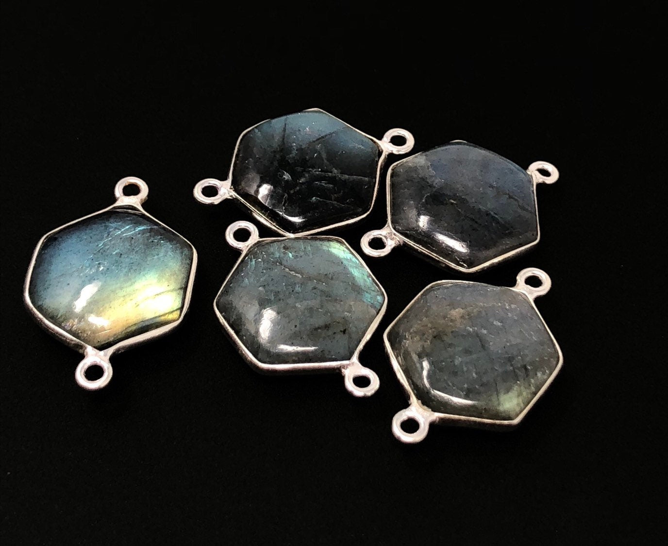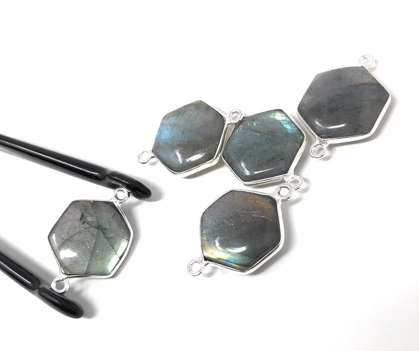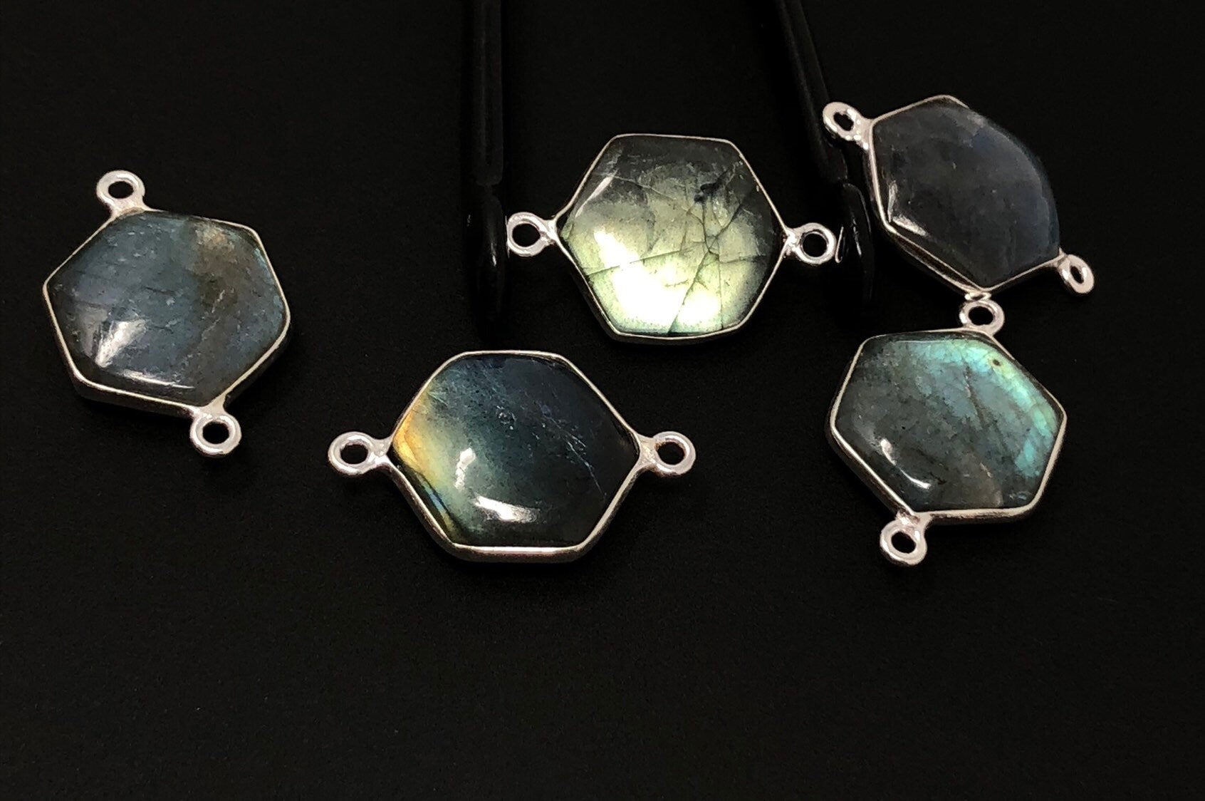 These beautiful Handmade Sterling Silver Natural Smooth Gemstone Labradorite Double Bail Hexagon Shape Connector are an excellent choice for making any Jewelry Design. It can be used for making Anklet, Bracelet, Necklace or can be used for making exclusive Jewelry Piece. It can also be used to make Gemstone Belt.