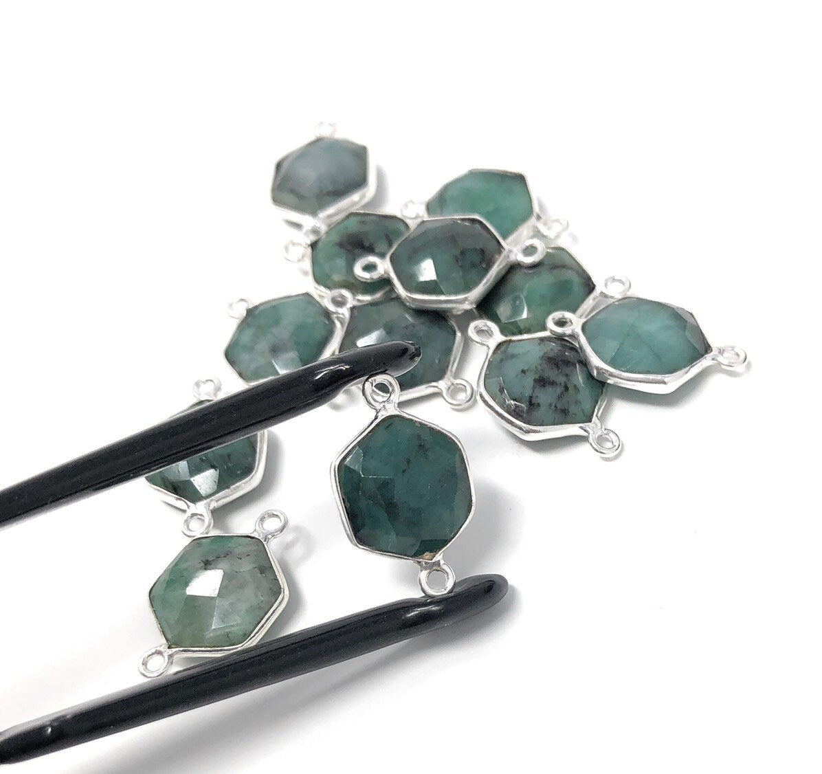 These beautiful Handmade Sterling Silver Natural Gemstone Sakota Emerald Double Bail Hexagon Shape Briolette Connector are an excellent choice for making any Jewelry Design. It can be used for making Anklet, Bracelet, Necklace or can be used for making exclusive Jewelry Piece. It can also be used to make Gemstone Belt.