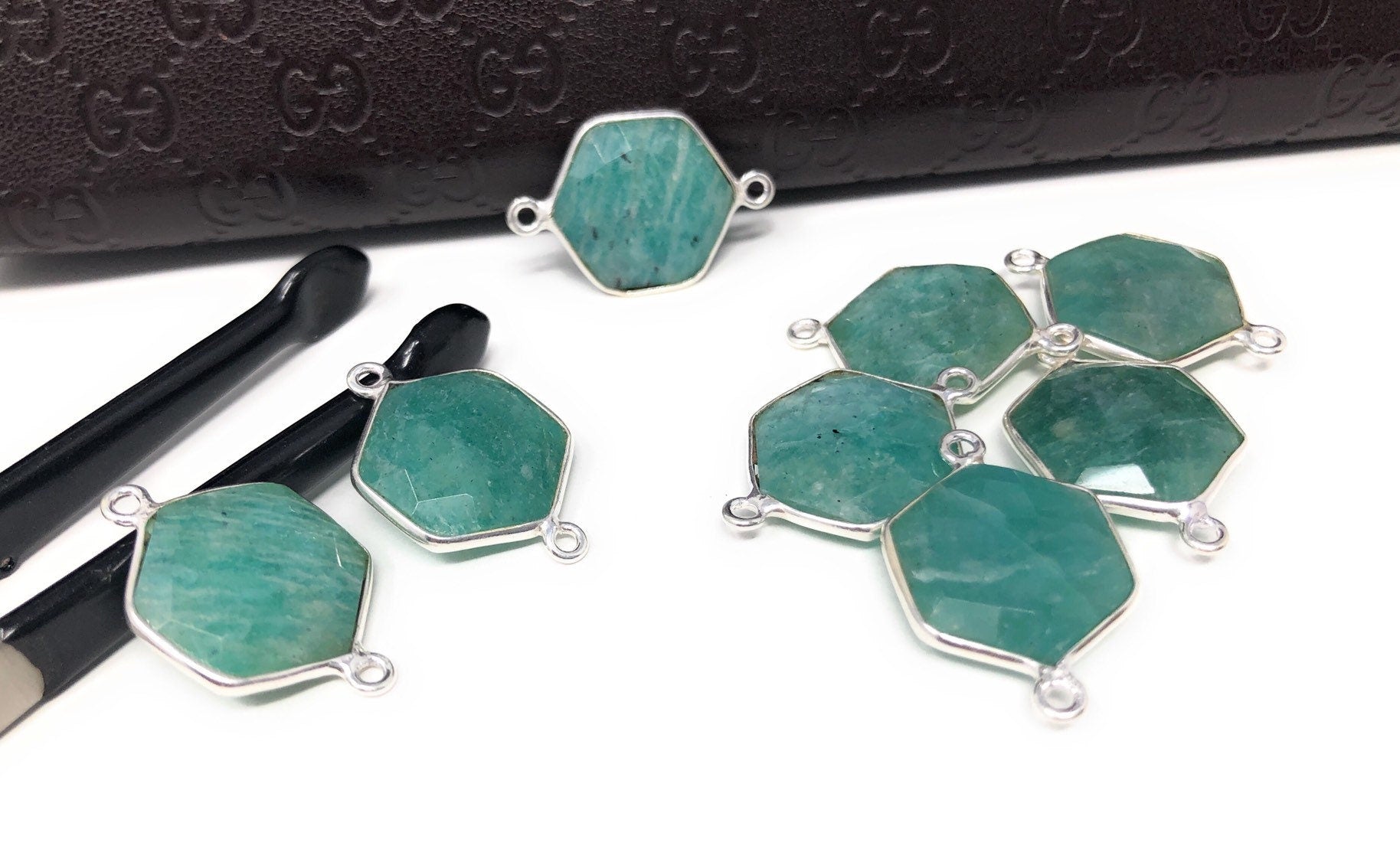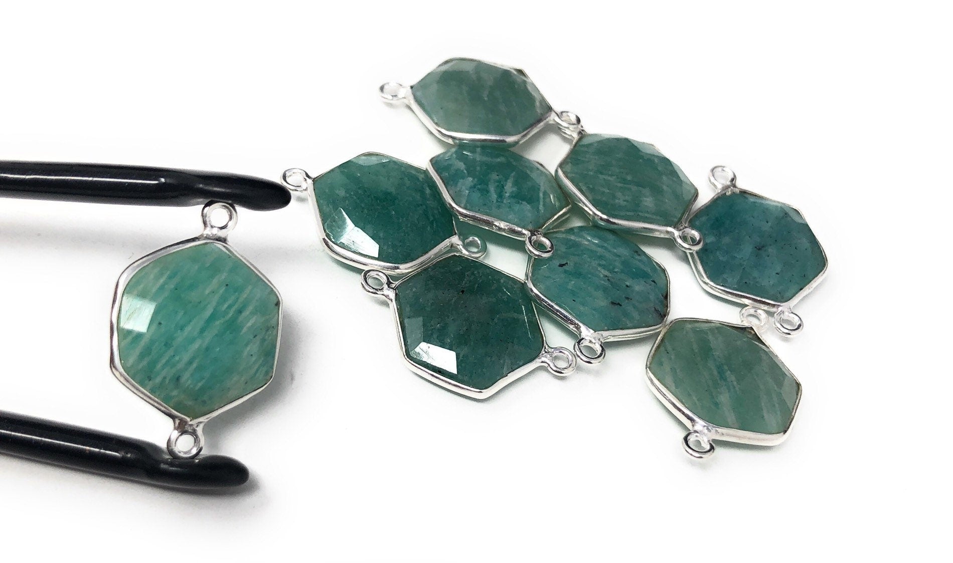 Sterling Silver Natural Gemstone Amazonite Bezel Set Double Sided Briolette Connector Jewelry Findings for Jewelry Making at Wholesale Price.