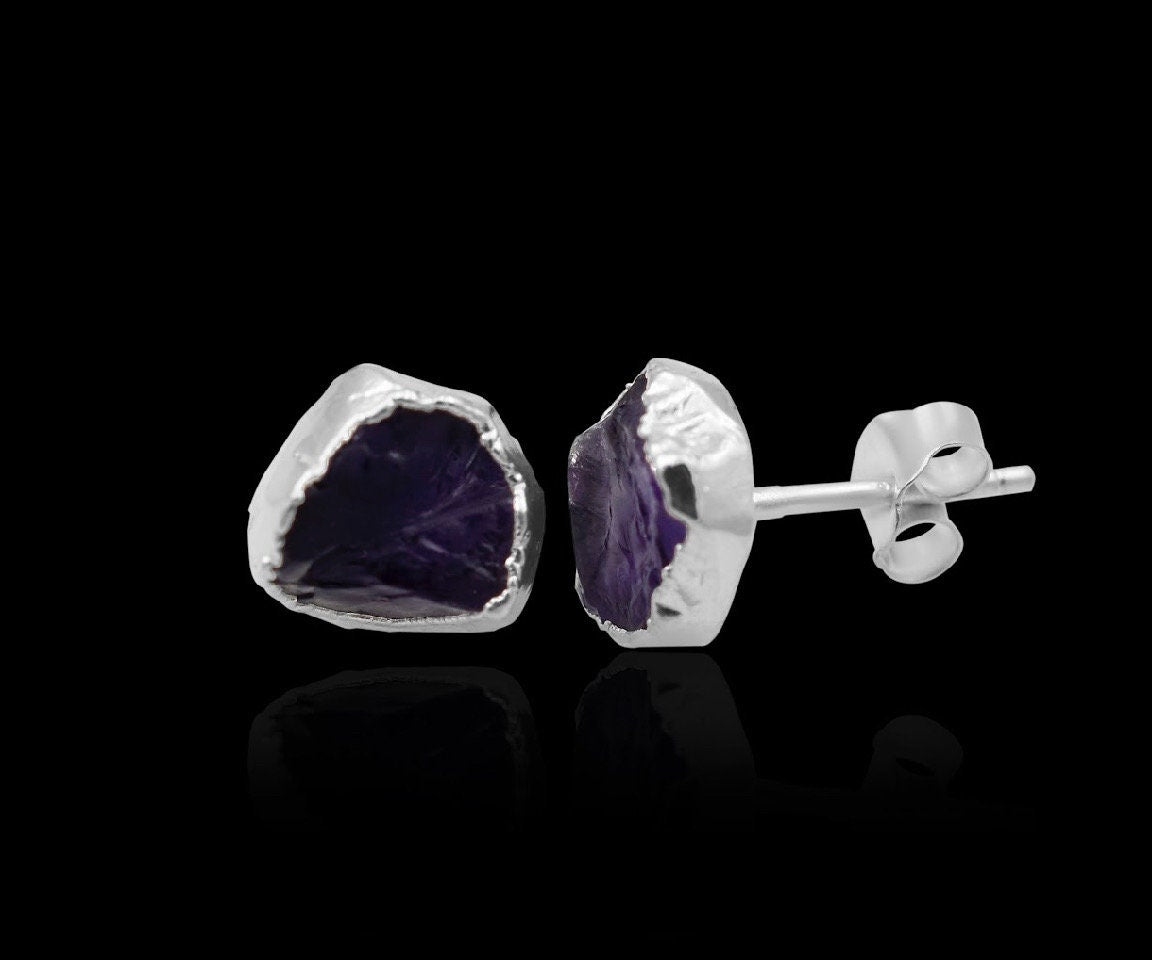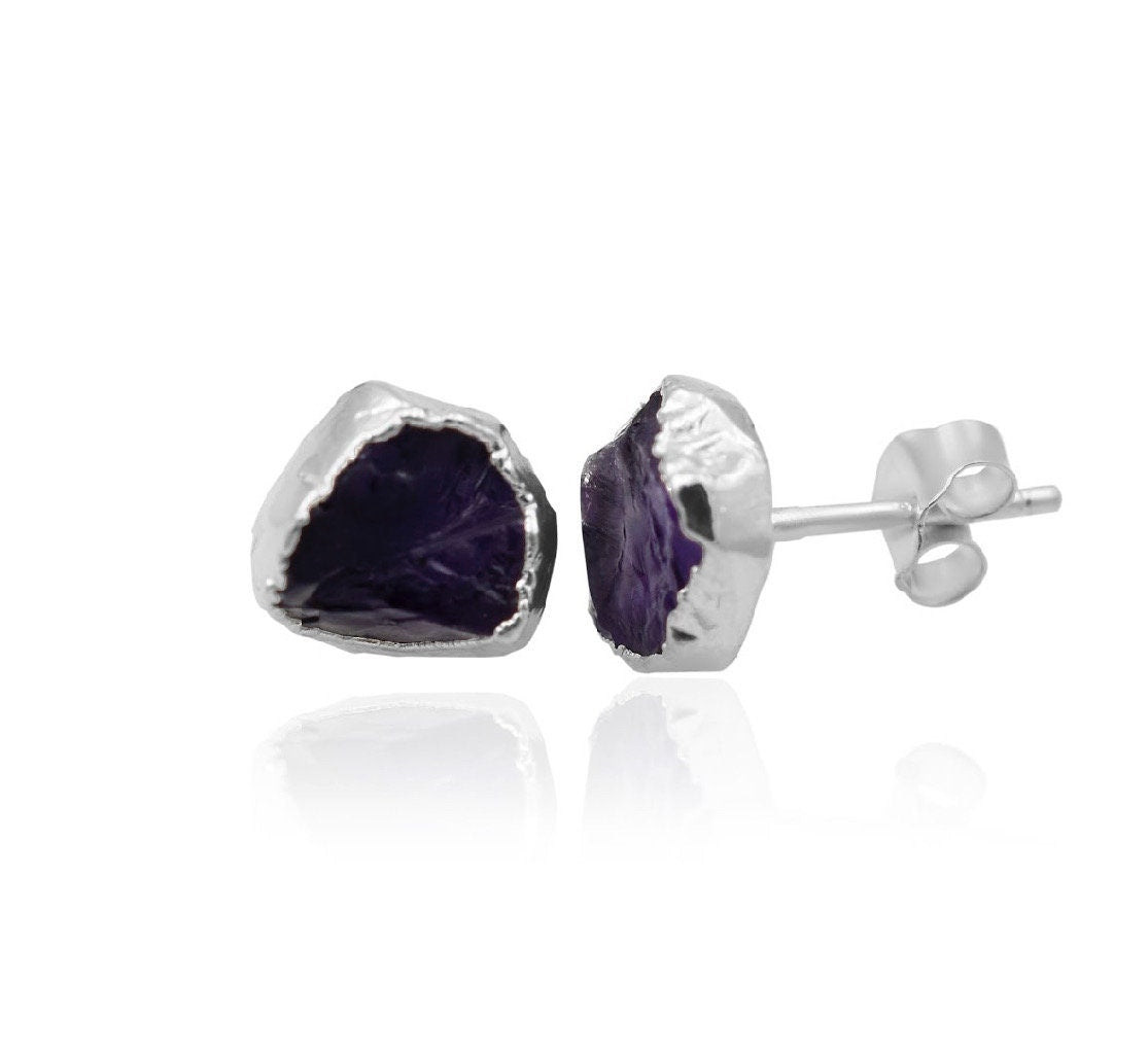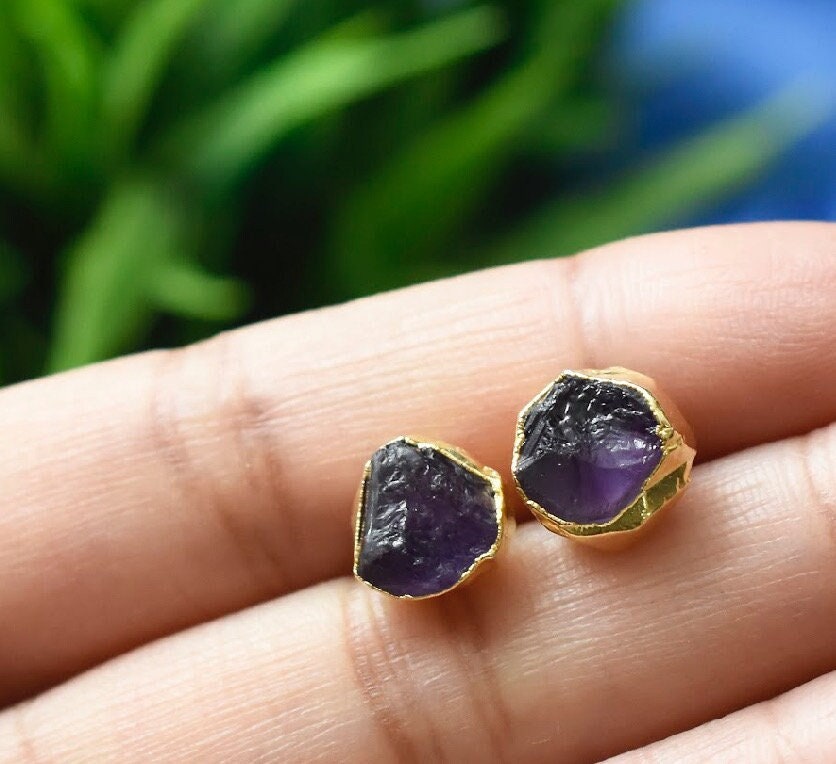 Raw Amethyst Stud Earrings, February Birthstone Healing Raw Crystal Studs, Rough Gemstone Electroplated Stud Earrings