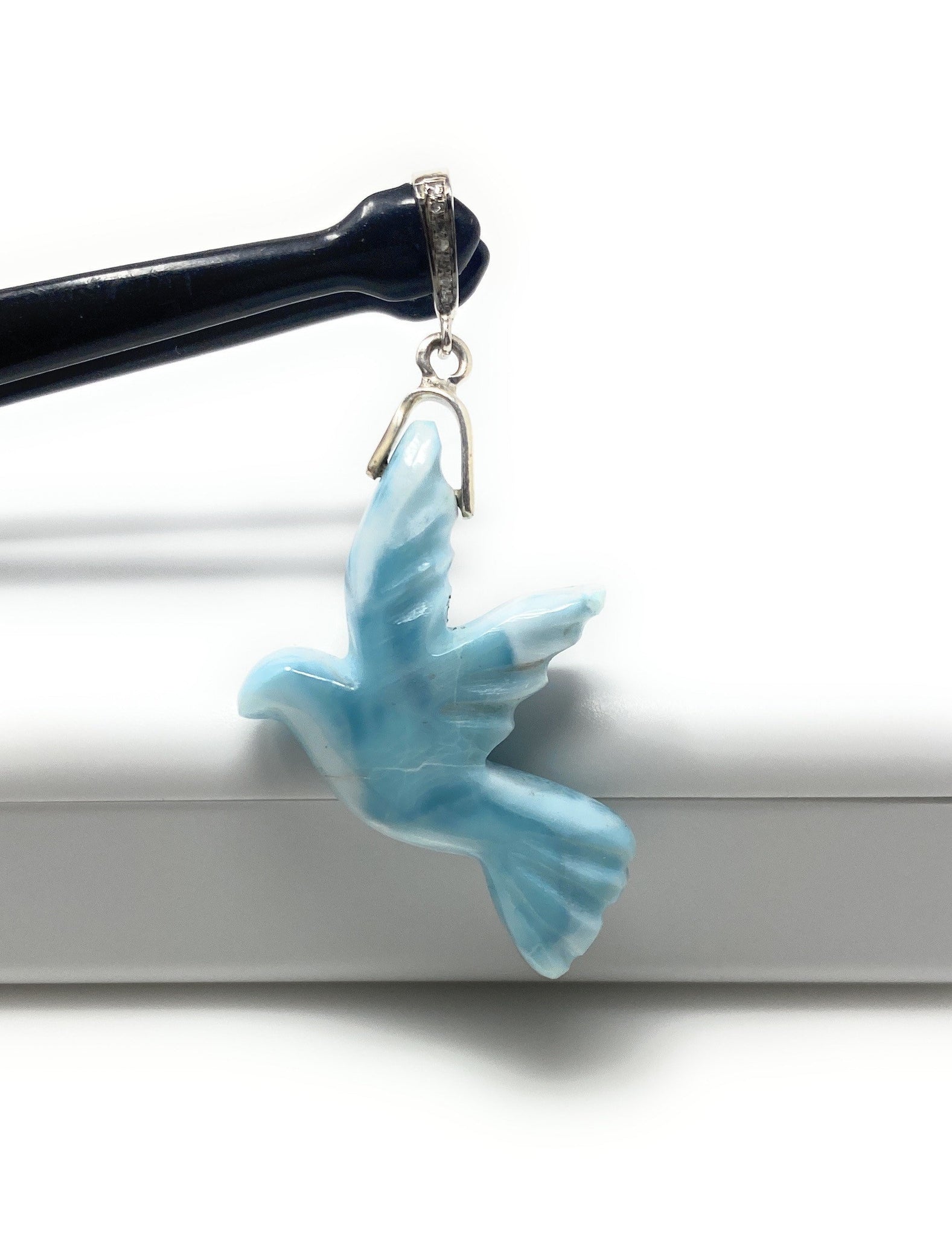 10g Rare Large Larimar Bird Pave Diamond Pendant, Silver Bohemian Jewelry, Dominican Republic Hand Carved Larimar Bird Pendant