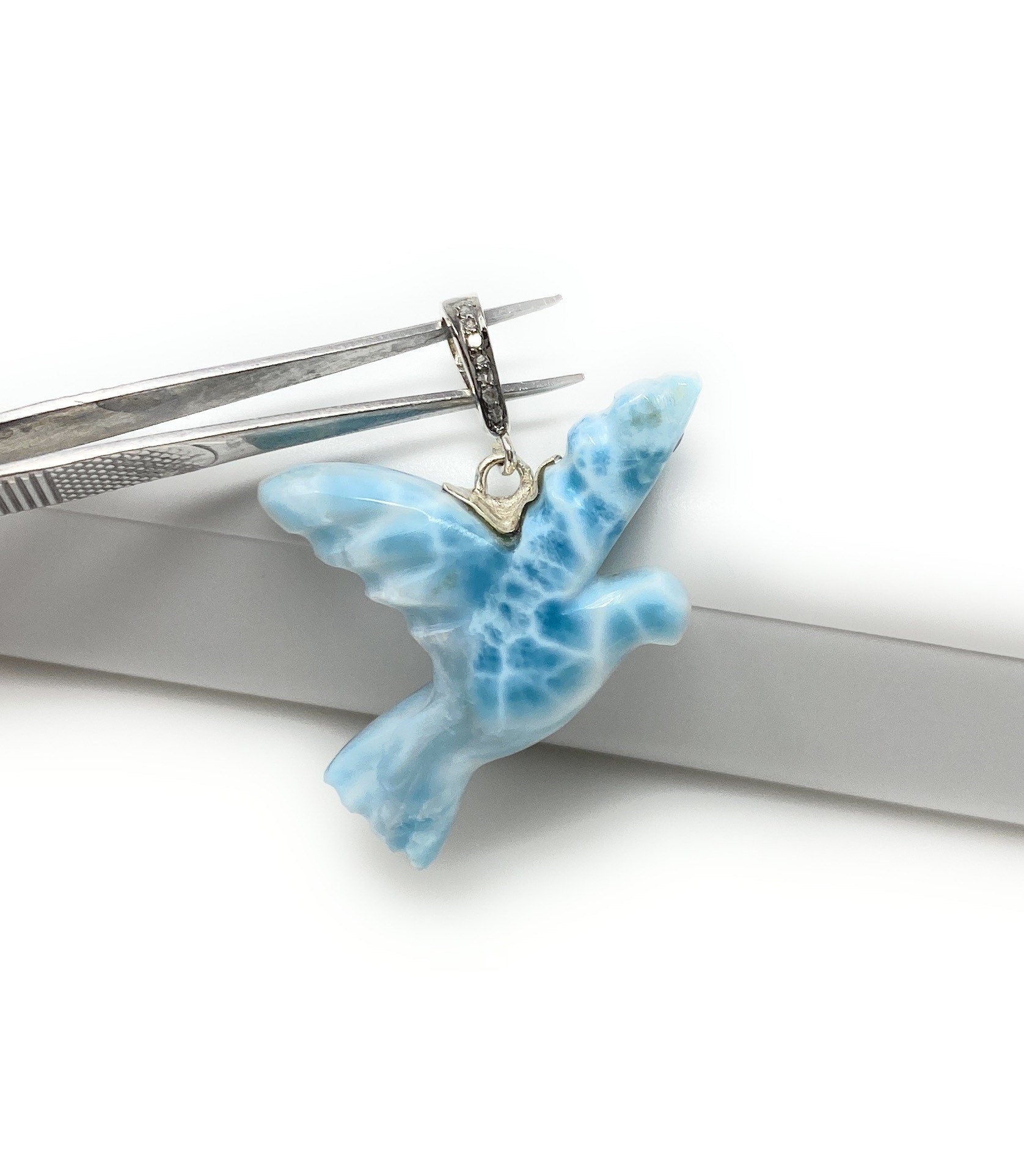 12g Rare Large Larimar Bird Pave Diamond Pendant, Silver Bohemian Jewelry, Dominican Republic Larimar Dove Pendant